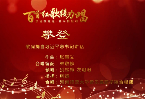 习近平总书记的金句中“青春”“奋斗”“攀登”言简意赅,字字珠玑,句句千钧,意涵深远,回味无穷,饱含着对青年人的大爱情怀和殷切期望。作为一名党员领导干部、老教育工作者和音乐的酷爱者,原省政协秘书长张秉义先生,从习近平总书记的讲话中摘取部分金句,作为歌词,经过潜心作曲,最终成就《青春》《奋斗》《攀登》三首主题歌曲。同时,著名作曲家朱敬修先生对三首歌曲进行合唱编配。在我省今年开展的庆祝建党百年“百首红歌接力唱”活动中,省教育厅将这三首歌曲作为重点推荐的合唱曲谱供广大师生传唱。今天,向大家展示的由伟德官网下载苹果版艺术教育委员会制作、音乐舞蹈学院协办的《攀登》,一起来看!