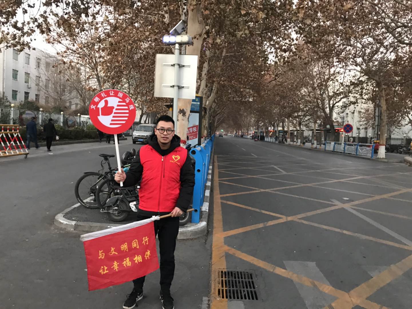 为开展好本次志愿服务活动,学院党委书记宋霞、院党委副书记曹崇及教师志愿者参加了本次活动。活动从早高峰7点20分开始,持续5个小时。志愿者身穿红马甲,手持小红旗和文明礼让牌,引导过往行人和车辆遵守交通,各行其道,并对非机动车越线停靠和行人穿行马路等不文明行为进行监督劝阻,保障市民的交通安全,维护校门口主干道的良好秩序。志愿者们不畏严寒、坚守在自己的岗位上,为文明城市建设贡献自己的一份力量。