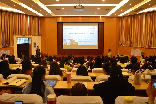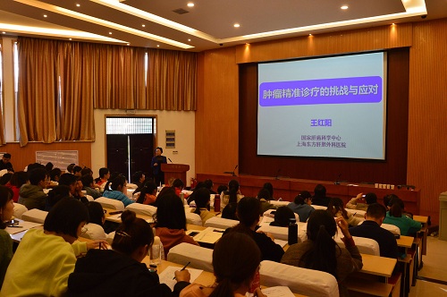 王红阳以“肿瘤靶向治疗的挑战与应对”为主题,介绍了肿瘤防治的国内外现状以及我国肿瘤疾病面临的严峻挑战。报告从肝癌的诊断标志物筛选开始,提出要解决中国的癌症治疗问题,必须要重视癌症的早期筛查及预防。王红阳还就癌症的免疫及靶向治疗、大数据、人工智能在肿瘤诊断中的应用等向师生们进行了深入浅出的介绍,提出精准医学研究的“最后一公里”只能也必须在医院里解决。最后,王红阳分享了自己对于癌症的年轻化、糖尿病、肥胖等现状与癌症的发生风险等方面提出的思考。