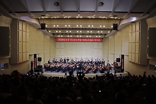 这场主题为“牢记初心使命、传承红色基因”的音乐会是我校为纪念《黄河大合唱》首演80周年特意重新编排和演出。音乐会通过独唱、合唱、对唱、吟诵等演出形式再现了80年前黄河两岸中华儿女可歌可泣抗日救亡的“黄河故事”。从陕北公学礼堂到我校帕瓦罗蒂音乐厅,史诗般的旋律和歌声仿佛穿梭时空,而当晚的歌声也如同历史的回声响彻师大的上空。