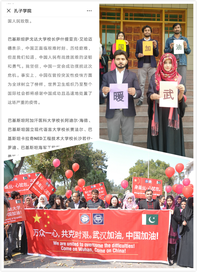 我校孔子学院合作院校——巴基斯坦萨戈达大学连续举办活动,先后制作了《巴基斯坦奶茶给武汉热干面加油》《此刻,巴铁对你说:坚信爱会赢》等视频,在校长艾哈迈德·伊什特、中国研究中心主任法扎尔·拉赫曼带领下,在该校师生中发起了支持中国抗击新冠肺炎疫情的校园声援游行,游行队伍高举“万众一心,共克时艰”“中国加油,武汉加油”“身虽远,心犹在”“我们在萨戈达大学,我们为中国加油”等内容的标语,挥舞着中巴两国国旗,在学校中阔步前进,为中国抗疫斗争加油鼓劲儿。国家汉办孔子学院公众号对艾哈迈德·伊什特校长的讲话进行了转发,经济日报新闻客户端先后两次报道了萨格达大学的声援活动。