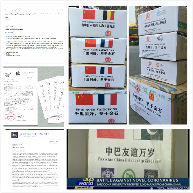 校长常俊标代表学校,向巴基斯坦、意大利、法国、德国、美国、俄罗斯、乌克兰、英国、日本、韩国、西班牙等国我校友好学校的师生致函,向他们表达全体师大人的慰问和支持,介绍我校抗击疫情所采取的措施、网上教学开展情况等,并向疫情严重的学校捐赠口罩等防疫物资。