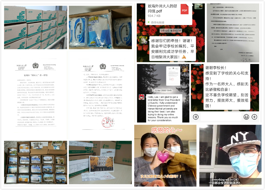 学校和相关学院分别以致函、致电、微信等不同方式向我校外籍专家、教师的健康和安全表达慰问和关心,对他们抗击疫情表示支持。为了外国专家和海外师大人的安康,学校相关部门与学院密切配合,发布防疫小贴士、组织收看解“疫”解疑网络直播节目、组织国内师生录制视频送祝福,并筹措口罩、手套等防护物资,为外国专家和海外师大人寄去带有美丽师大校园风景和学校关心问候话语的健康包,学校永远会与大家并肩同行、同舟共济、共克时艰。