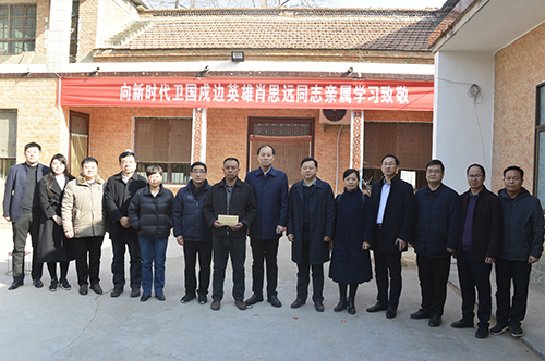 2月23日,我校党委副书记、工会主席梅宪宾一行来到延津县石婆固镇龙王庙村,代表学校向卫国戍边英雄肖思远烈士表达了崇高的敬意,向烈士家属表达了诚挚的问候,并送上了慰问金和慰问品。校工会、宣传部相关负责人及部分分工会主席参加,延津县人民政府副县长刘为伶、石婆固镇党委书记李宗泽陪同。
