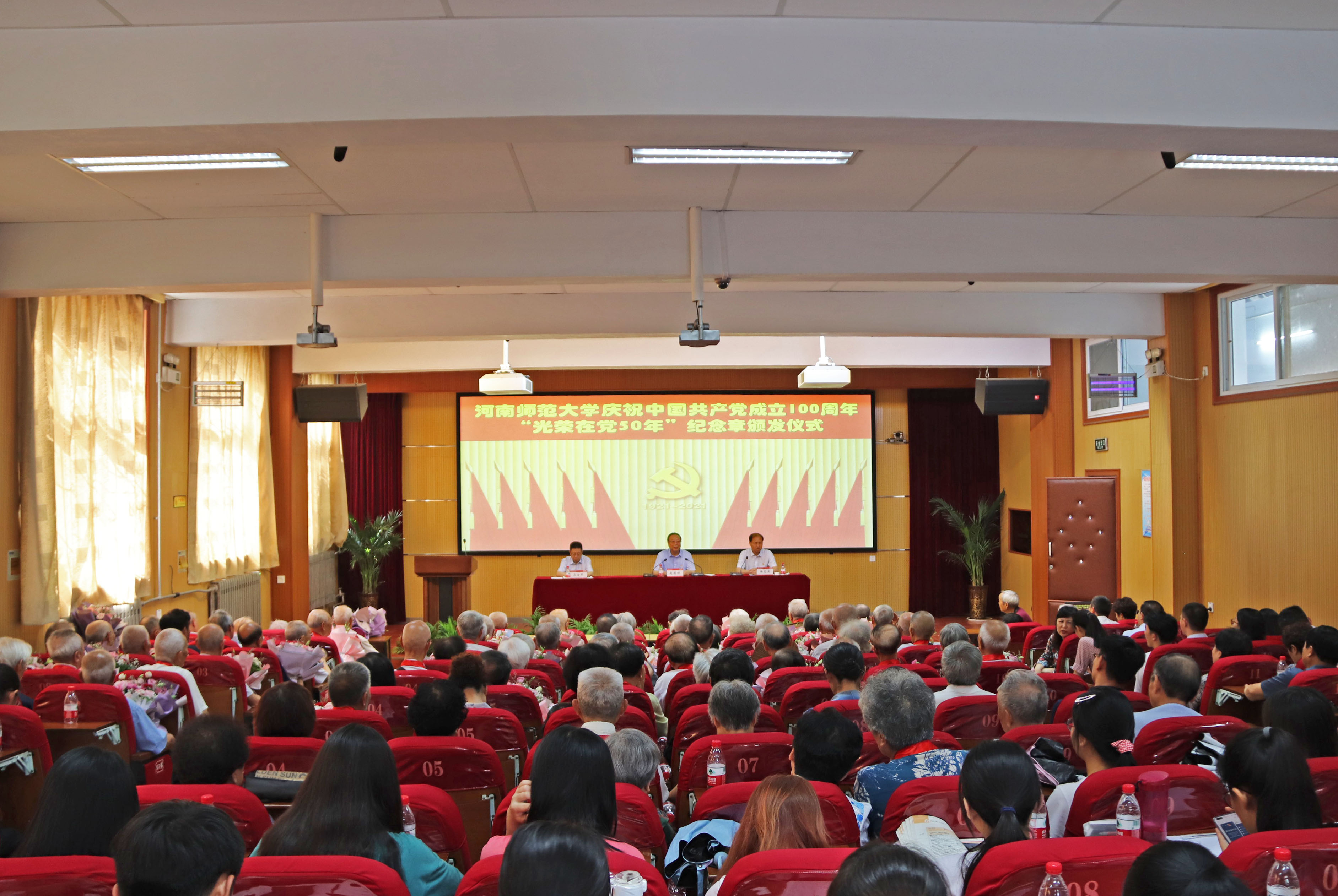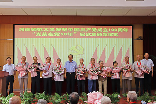 仪式上,马治军宣读“光荣在党50年”党员名单,全校共有132位党龄满50年的老党员荣获纪念章。赵国祥为老党员代表颁发“光荣在党50年”纪念章,学生党员代表为老党员敬献鲜花。老党员代表俞雄和青年学生党员代表外国语学院2018级英语教育专业张逸帆作了发言。