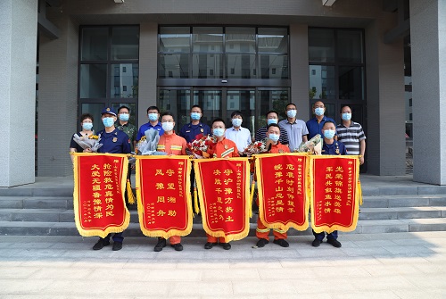 郭海明代表学校党政领导班子和全体师生向驻营在平原湖校区的上海消防救援总队、安徽省消防救援总队、山东省消防救援总队、湖南省消防救援总队、新乡市消防救援支队赠送锦旗和鲜花,向奋战在河南抢险救灾一线的消防战士表示由衷感谢和诚挚问候,向抗洪救援队伍致以崇高的敬意。