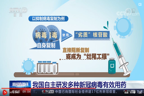 今日,阿兹夫定作为抑制新冠病毒复制的代表性药物登上央视新闻。央视新闻对其抗新冠病毒作用机制进行了形象介绍。