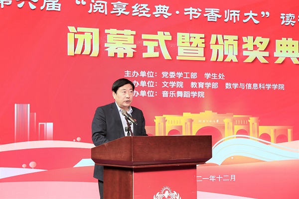 陈广文致闭幕辞。他表示,阅读是水平提升之路、人生成长之梯,更是文明传承之途、社会进步之力,对引导学生学习习近平总书记“爱读书、读好书、善读书”的读书之道具有重要作用。他指出,本次活动主题鲜明、形式新颖、内容丰富,引导同学们在阅读经典中弘扬“崇文明道、尚诚守德、抱朴求真”的师大精神,培养“坚定理想信念、矢志拼搏奋斗”的家国情怀。陈广文向同学们提出三点希望:一是力学笃行,于浩瀚书海中勇于探求真知;二是勤于思考,于品味经典中绘就美好蓝图;三是躬行实践,于不懈奋斗中书写人生华章。他引用习近平总书记在庆祝中国共产党成立100周年大会上对青年的殷切寄语,鼓励同学们在品鉴经典中化平凡为绚烂,在阅读中提升自我,在经典中涵养人生,在奋斗中砥砺品质,在实践中增长本领,为实现中华民族伟大复兴中国梦贡献青春力量。
