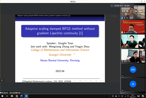 应数学与信息科学学院邀请,广西大学袁功林教授(博士生导师)于4月14日在腾讯会议平台上作了题为《Adaptive scaling damped BFGS method without gradient Lipschitz continuity》的专题学术讲座。学院相关研究方向青年教师、研究生50余人参加此次会议。