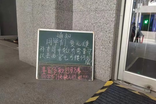 西寓七号楼的爱心缝补小铺里,值班阿姨韩瑞娟熟练的扣下锁头,踩动踏板,缝纫机在裤边留下一串整齐细密的线条。“同学,这是你的衣服。”她将刚缝补好的衣服叠整齐后,递给了来取衣服的学生。特殊形式下,我校特地开展免费缝补和自行车维修活动来帮助学生解决生活中遇到的困难。为了防止学生取错衣服,韩瑞娟贴心的在衣服上夹上小牌子。“大家来这里上学,离家都挺远的,父母也不在身边,我们也是尽自己的能力,能帮到一点是一点”,韩阿姨亲切地说。