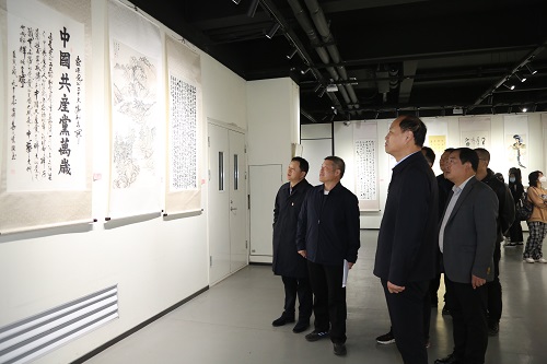 为庆祝中华人民共和国成立73周年,喜迎党的二十大胜利召开, 10月8日,“翰墨抒写新时代 同心献礼二十大”书画展在美术学院一楼展厅开幕。校党委副书记、工会主席梅宪宾出席开幕式并讲话,开幕式由校工会副主席王俊杰主持。相关职能部门负责人及部分教职工代表、学生代表参加开幕式并参观展览。