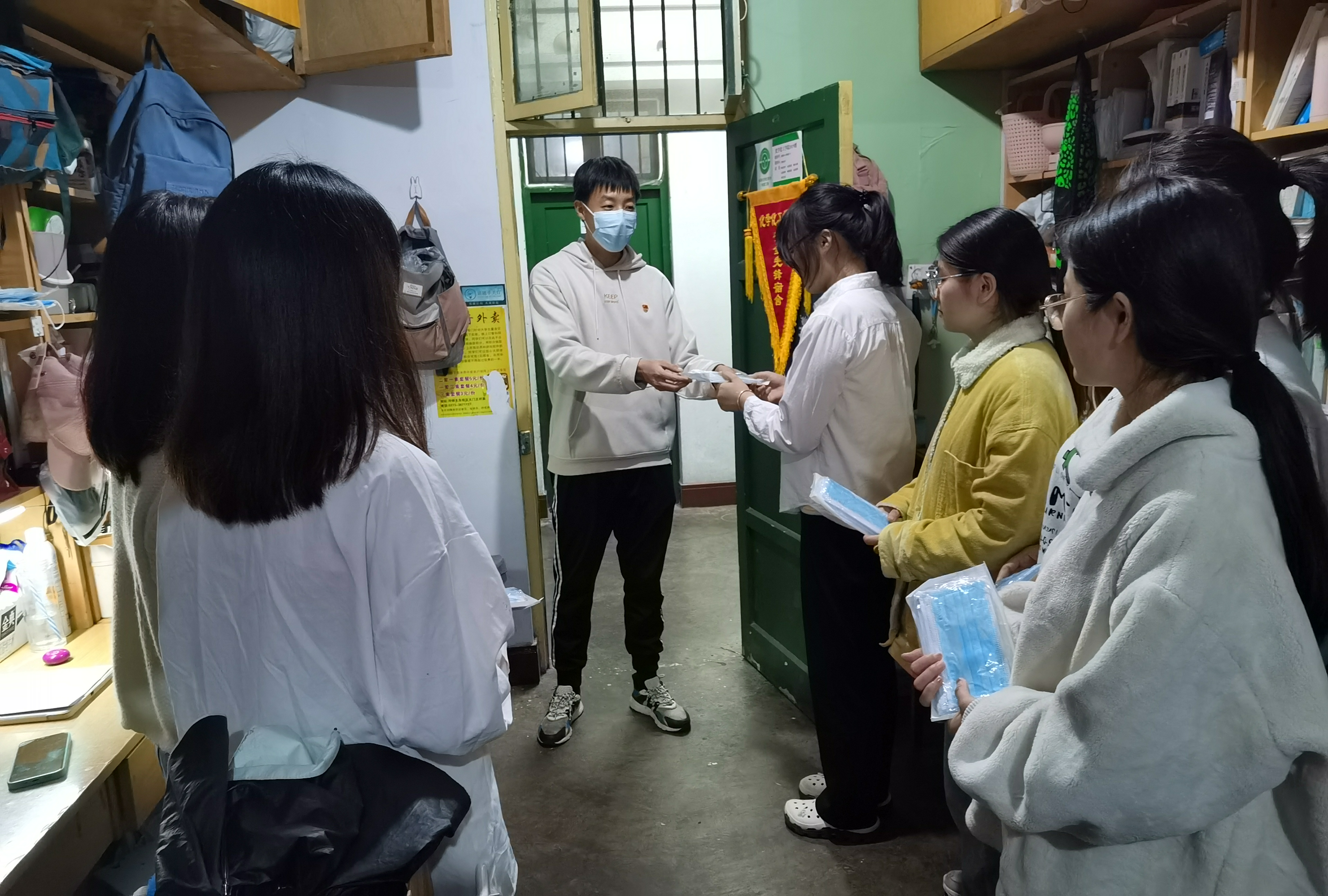 化学化工学院辅导员汤润民化身送货员,定期将学院发放的抗疫物资分批次配送给同学们,如水果、方便食品、生活必需品、防护服、口罩等。辅导员们始终坚持学生的事无小事,在严峻的疫情防控形势下,为学生提供无忧的日常生活保障,确保学生在校安心学习。