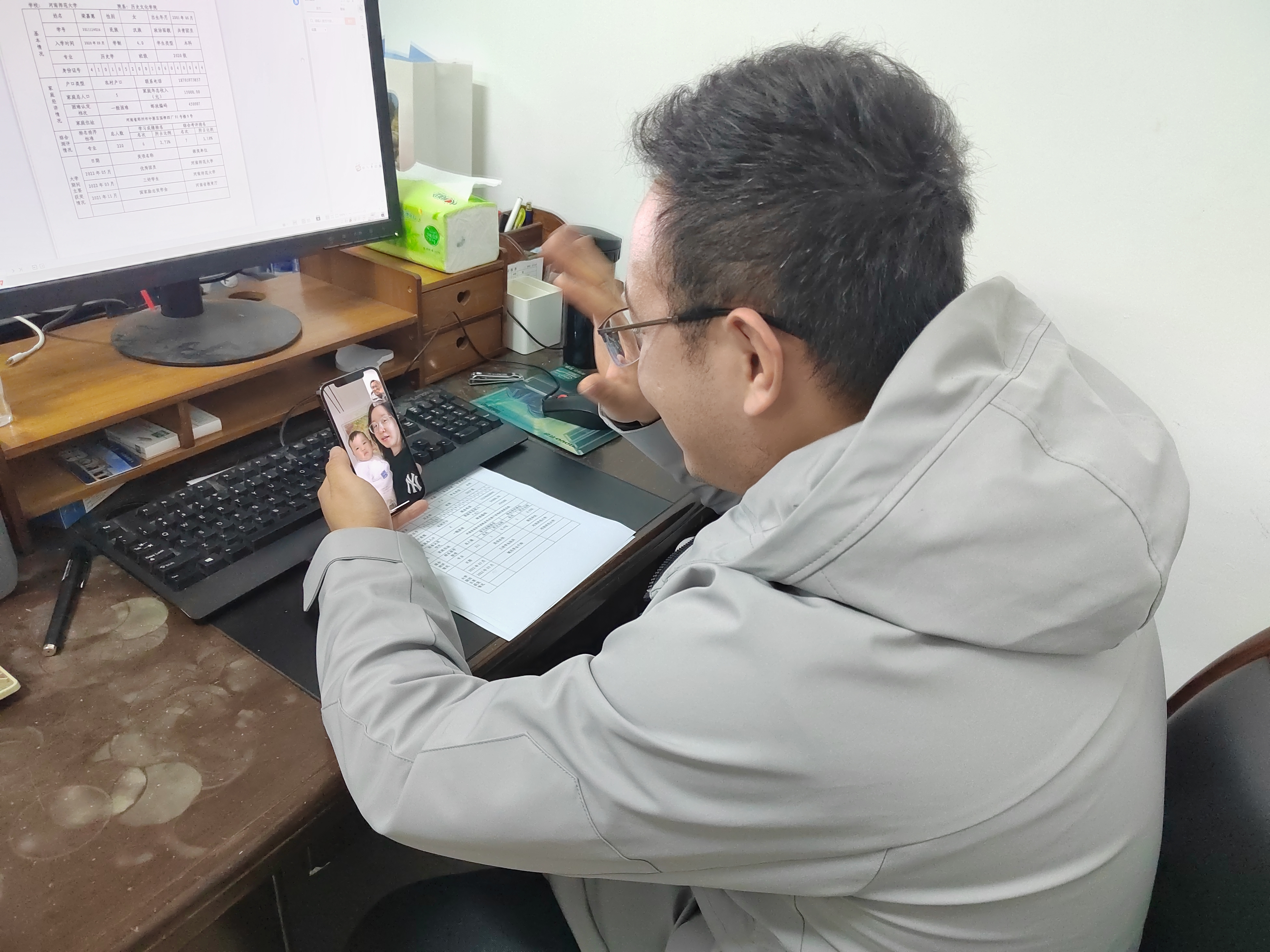 体育学院辅导员刘广宣每天再忙都坚持抽出时间与所有居家隔离的同学通一次视频电话,与年级学生召开一次视频会议,和学生们谈话谈心,舒缓焦虑情绪,为他们传递抗疫信心,引导学生合理安排校园学习生活。