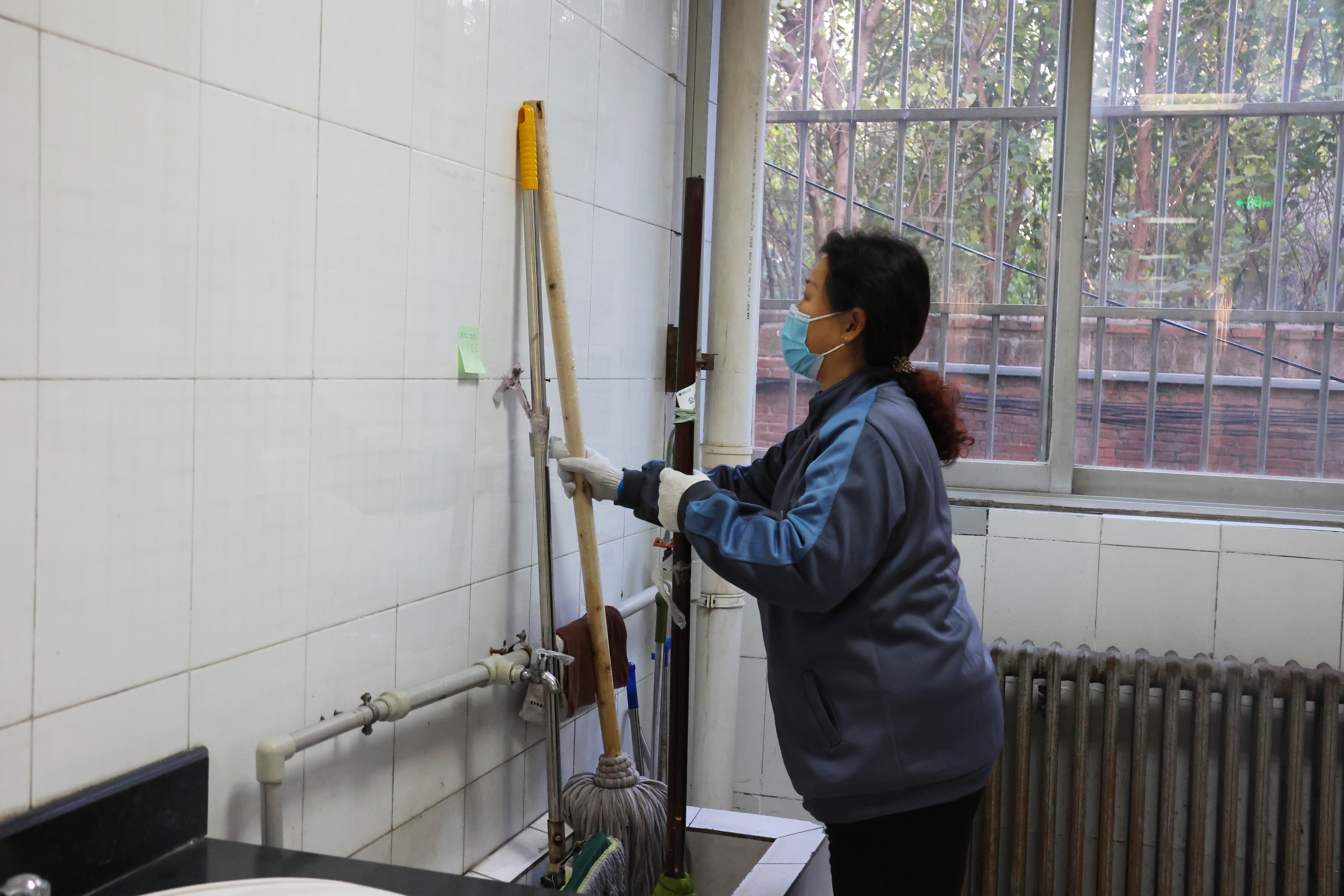 除了全校的餐饮保障工作,疫情期间校园环境的整洁卫生同样重要。负责打扫物理北楼的保洁员郝红利,每天早上六点开始对教学楼进行清扫、消杀,还会协助学生志愿者查验进出人员的场所码。随着晚上十一点多教学楼熄灯,郝红利也结束了一天的工作,“在接到学校封闭管理的通知后,我选择了坚守工作岗位。学校各项工作繁重,我帮不上大忙,但也想尽自己的一份力。”