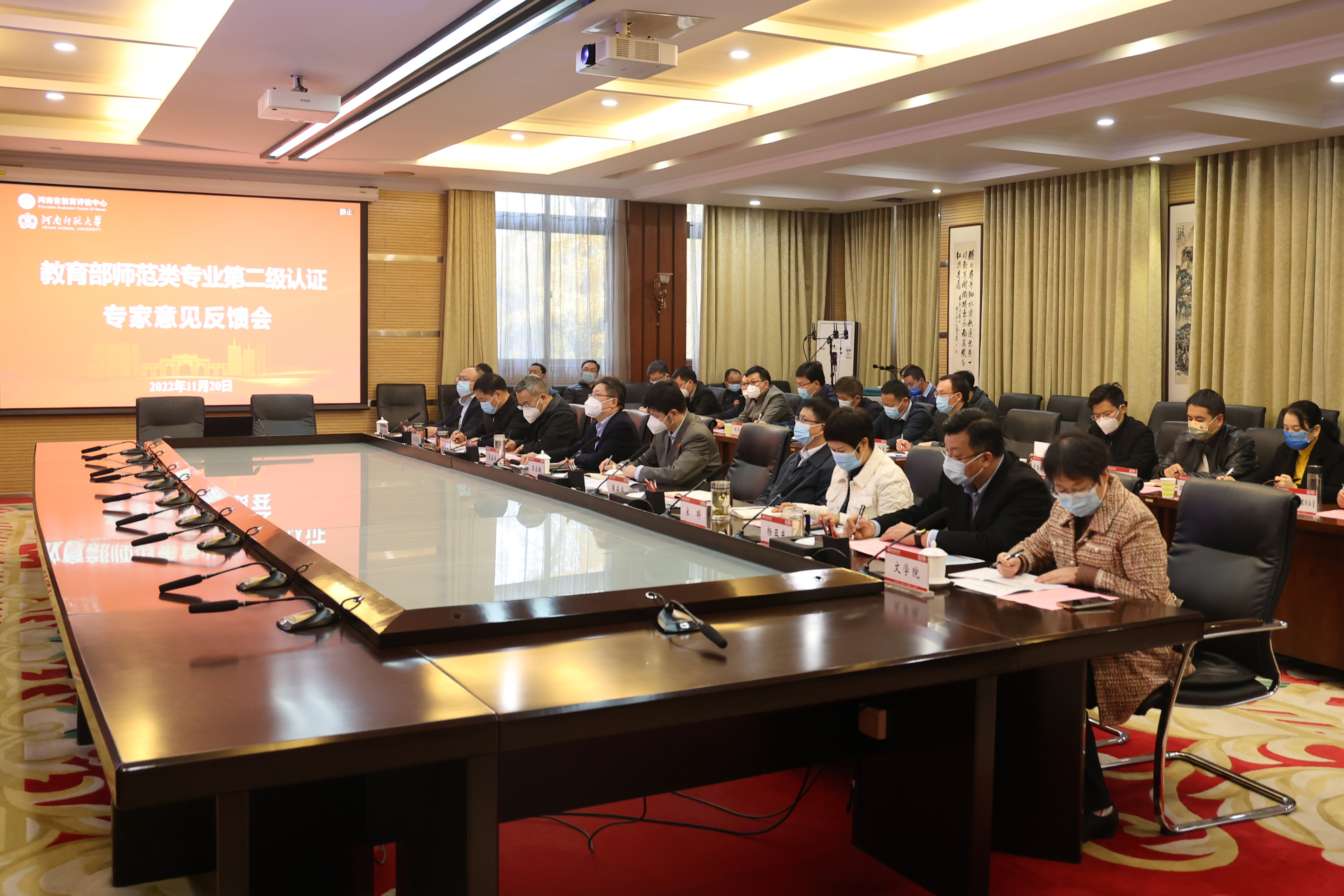 11月20日,我校召开教育部师范类专业认证专家意见反馈会。认证专家组全体成员,全体在校校领导出席会议。相关职能部门负责人、认证学院全体领导和专业负责人参加会议。反馈会由联合认证专家组组长、教育部师范类专业认证专家委员会委员、学术委员会主任宋冬生教授主持。会议以线上线下相结合的方式进行。