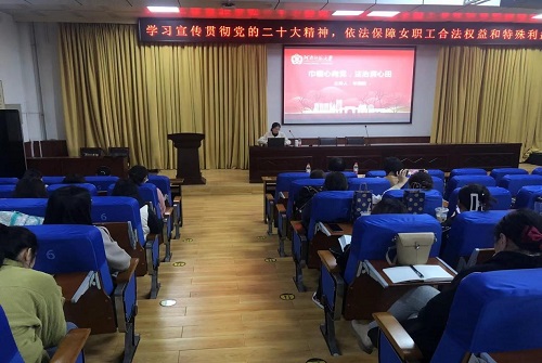 3月21日下午,校工会邀请我校法学院教师丰瑞娜在党校教室开展“学习宣传贯彻党的二十大精神,依法保障女职工合法权益和特殊利益”为主题的普法宣传讲座,各分工会近百名女教职工参加,讲座由校工会副主席、女工委主任赵旭主持。