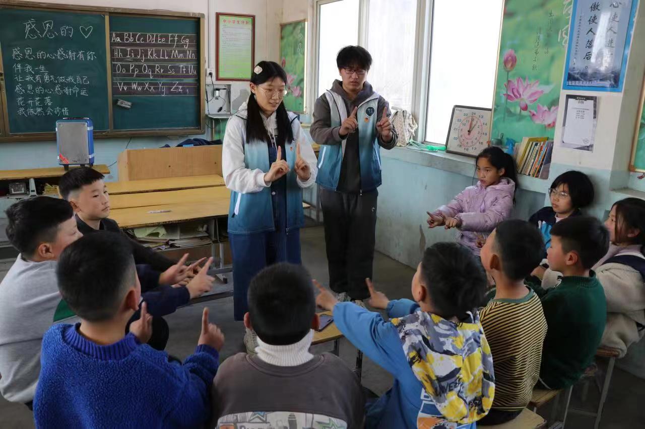 “感恩的心,感谢有你……”稚嫩的童声从教室中传出。循声望去,只见孩子们围坐一圈,一边唱歌一边跟着志愿者学习手语动作。“老师,你看我做的对吗?”志愿者在夸奖学生的同时细心纠正了他的手势。“看着孩子们天真无邪的面容,听着他们口中一声声的‘老师’,我的心中充满了满足与幸福。”活动负责人、2021级教育学部的刘子依说。