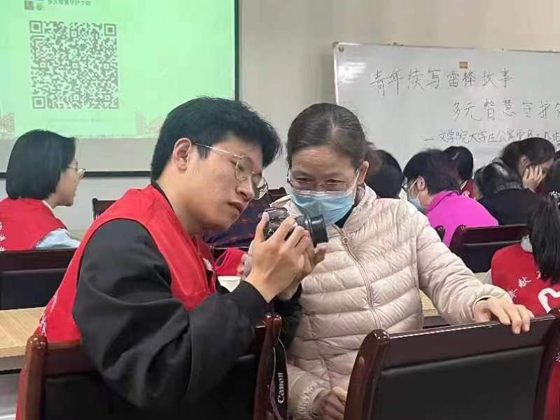 “旋转镜头就可以进行拍摄了,您也可以直接触屏进行对焦和拍照……”师大家属院中,文学院党员工作站的青年党员正耐心地手把手教老人如何使用相机。一位阿姨特意带着自己的相机来听讲,一边交流,一边试着调制好相机的参数进行拍摄。