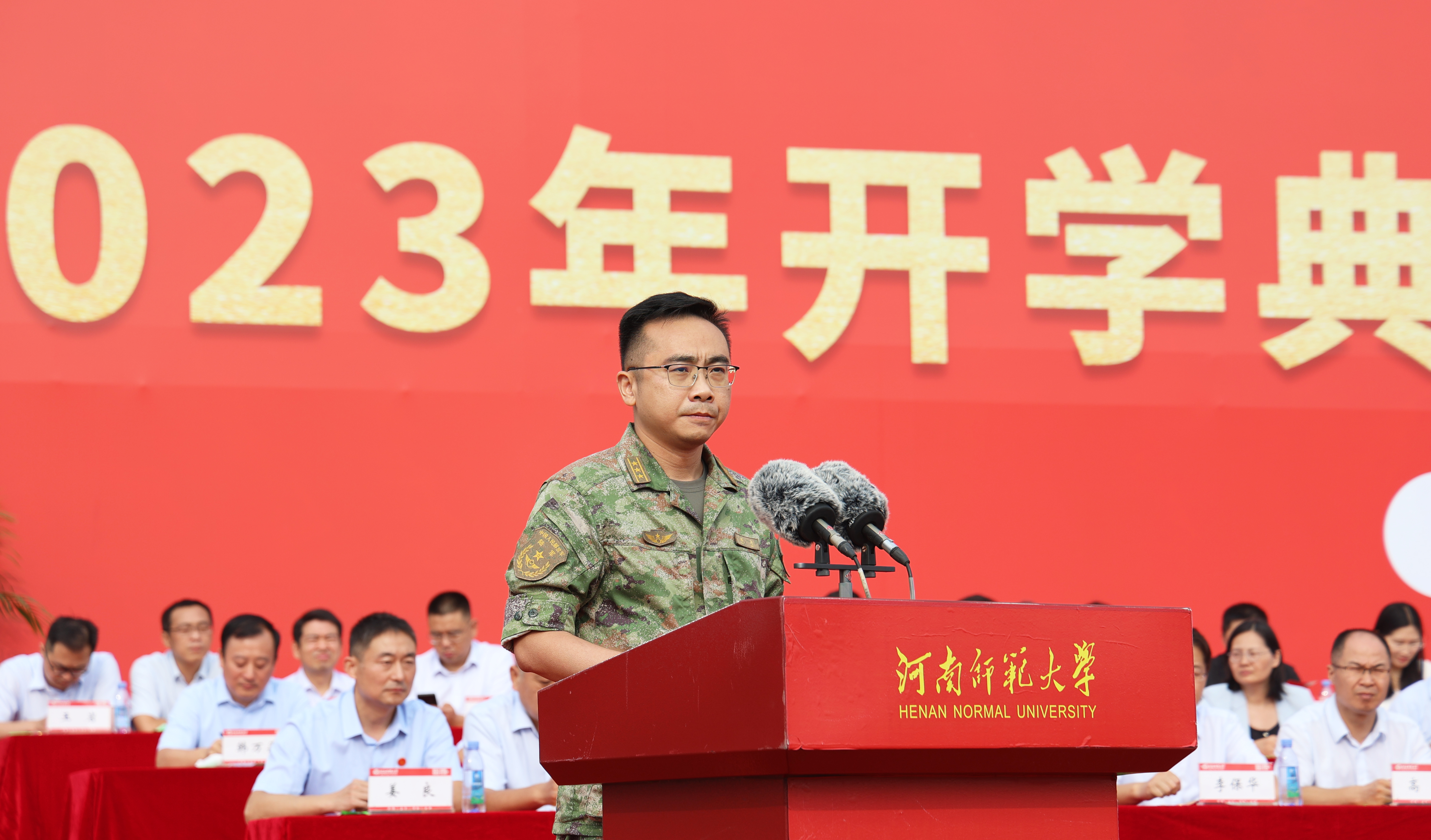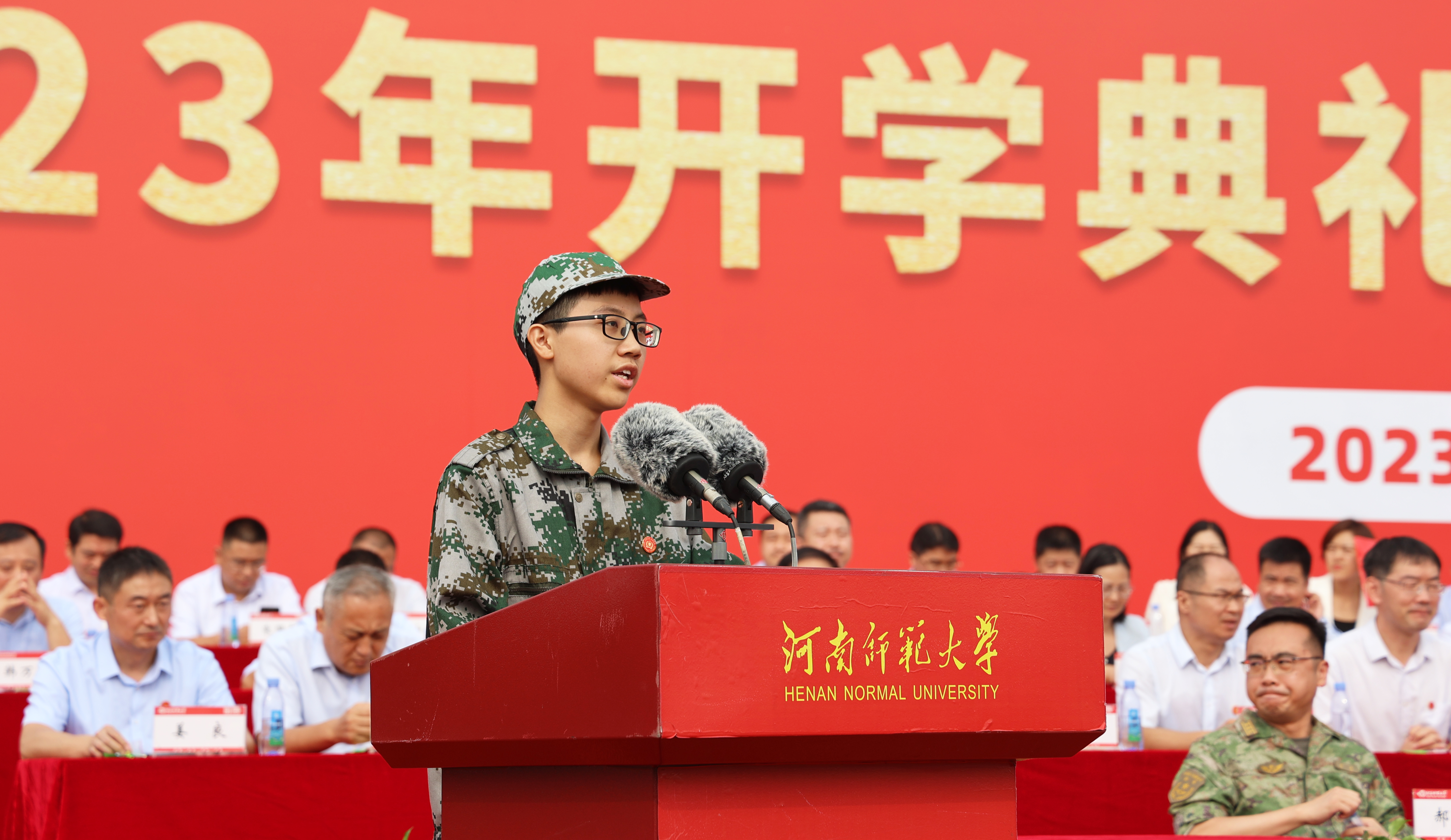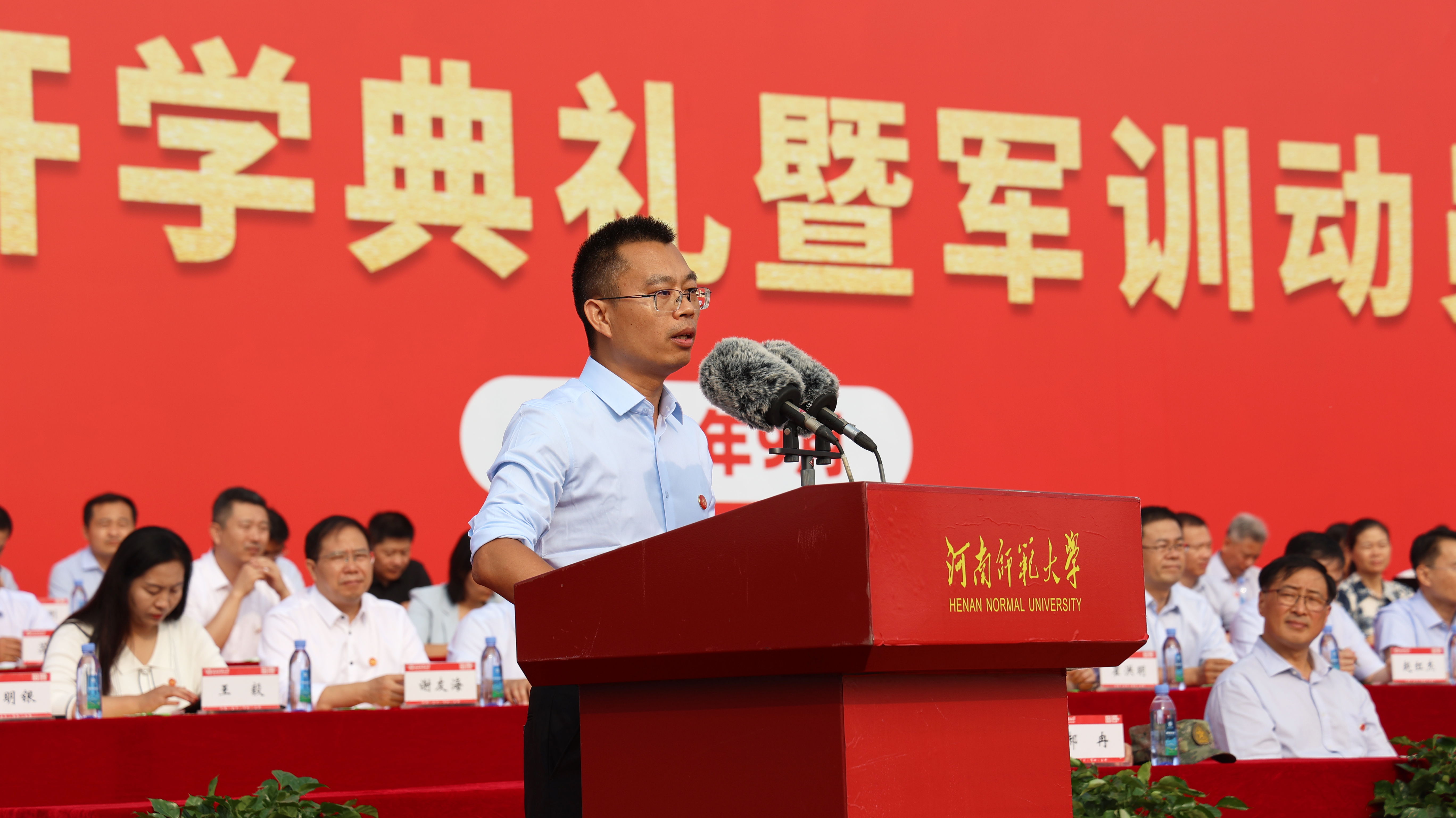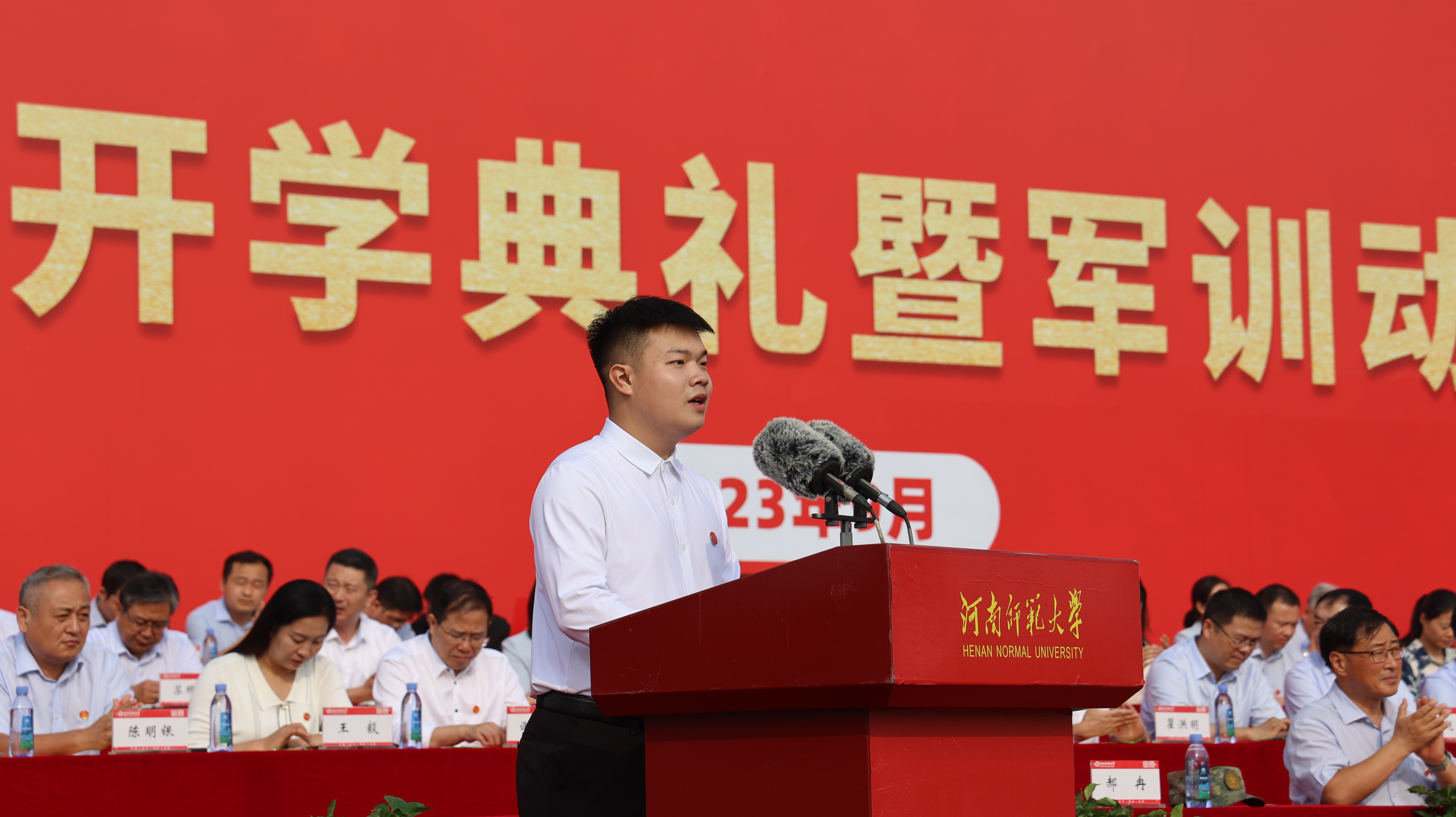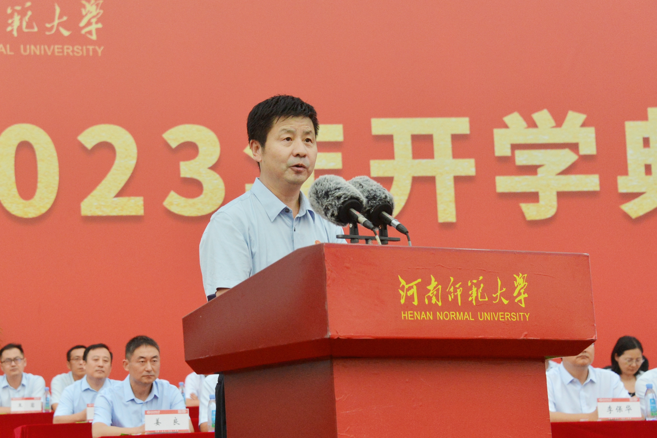校党委书记、校长王宗敏以《乘百年荣耀,启奋斗新程》为题发表讲话。他代表学校向全体新生表示热烈的欢迎和祝贺,向各位老师和亲友致以衷心感谢和崇高敬意。他指出,同学们的青春未来将与师大的光辉历史紧密相连,见证师大第一个百年华诞,参与书写师大未来壮阔画卷,共享师大百年荣耀。师大之荣耀,熔铸在百年薪火相传、弦歌不辍的红色基因里。百年来,师大人爱党爱国的红色基因永不变色,铸就了为党育人、为国育才的光辉历程,谱写了一曲曲高扬爱国主义精神和民族精神的时代壮歌。师大之荣耀,凝聚在百年开拓创新、矢志一流的奋斗追求上。百年师大立足国家需求,书写了紧跟时代步伐、勇于开拓创新的奋斗篇章。近年来,学校坚持“跳出师大办师大、跳出教育办教育”,坚定不移走交叉融合、协同创新、重点突破的“华山之路”,开启了师大新百年的宏伟蓝图。师大之荣耀,镌刻在百年精育良才、教育报国的使命担当中。百年师大累计为党和国家培养了各类人才30余万人,引领示范河南教师教育改革的作用日益彰显,撑起了河南基础教育的半壁江山。百年师大办学历程,熔铸了“厚德博学、止于至善”的校训精神,形成了“明德、正学、倡和、出新”的优良校风。这是指引师大人追求卓越的“奋斗密码”,也是学校争创一流的“荣耀之源”。