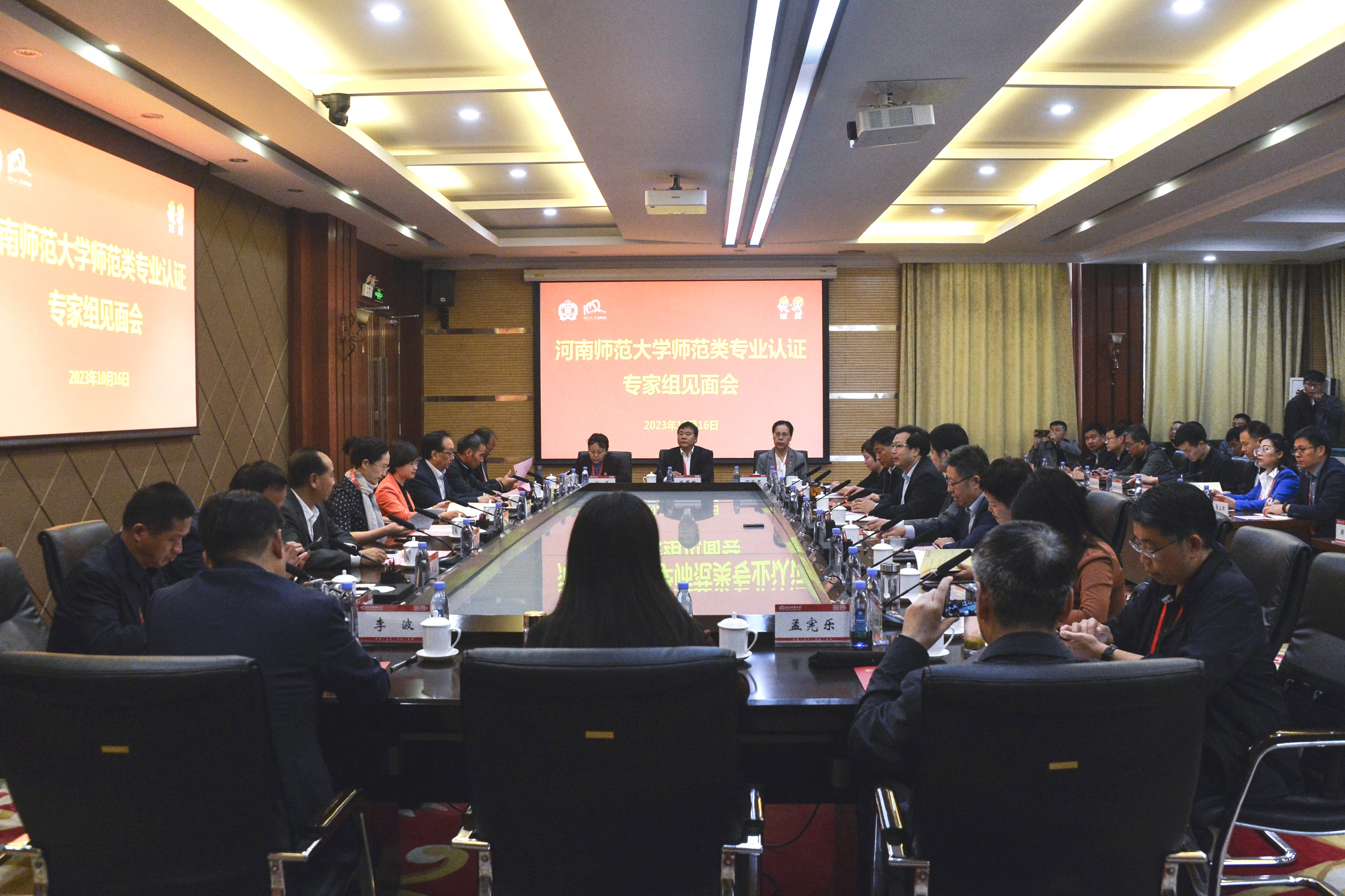 10月16日,我校召开教育部师范类专业认证进校考查专家组见面会。联合认证专家组组长、音乐学专业认证专家组组长、黑龙江省教育评估院院长景丽英,心理学专业认证专家组组长、原合肥师范学院副校长姚本先,历史学专业认证专家组组长、广西师范大学教务处处长周长山,信息与计算科学专业认证专家组组长、华中师范大学胡响明及专家组全体成员,河南省教育厅教师教育处处长李松原,河南省教育评估中心副主任张新民,校党委书记王宗敏,党委常委、副校长李雪山,副校长宋晔,党委常委、纪委书记、监察专员王玉良出席见面会,相关职能部门负责人、本次认证相关学院及其他师范类专业学院负责人参加会议。见面会第一阶段由校党委副书记、工会主席马治军主持。
