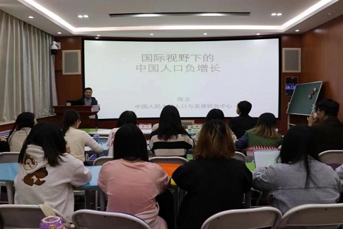 10月23日下午,应社会事业学院邀请,《人口研究》常务副主编、中国人民大学博士生导师陈卫教授于崇智楼503会议室作题为“国际视野下的中国人口负增长”的讲座。学院相关师生参加此次讲座。讲座由社会事业学院副院长海龙主持。