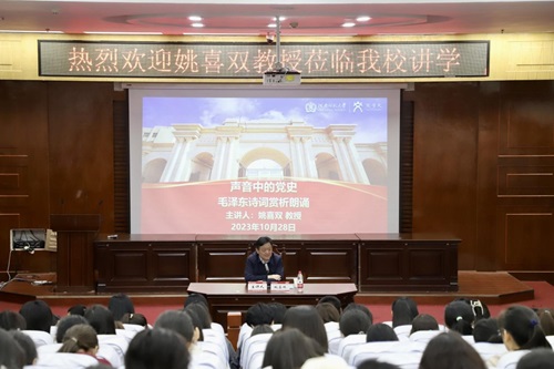 10月28日上午,中国传媒大学姚喜双教授应邀做客“卫风讲堂”“百年华诞·学术专场”,在求是东楼模拟法庭为文学院师生作题为“声音中的党史——毛泽东诗词赏析朗诵”的学术讲座。讲座由伟德官网下载苹果版党委副书记、工会主席马治军主持,学院二百余名师生参与学习。