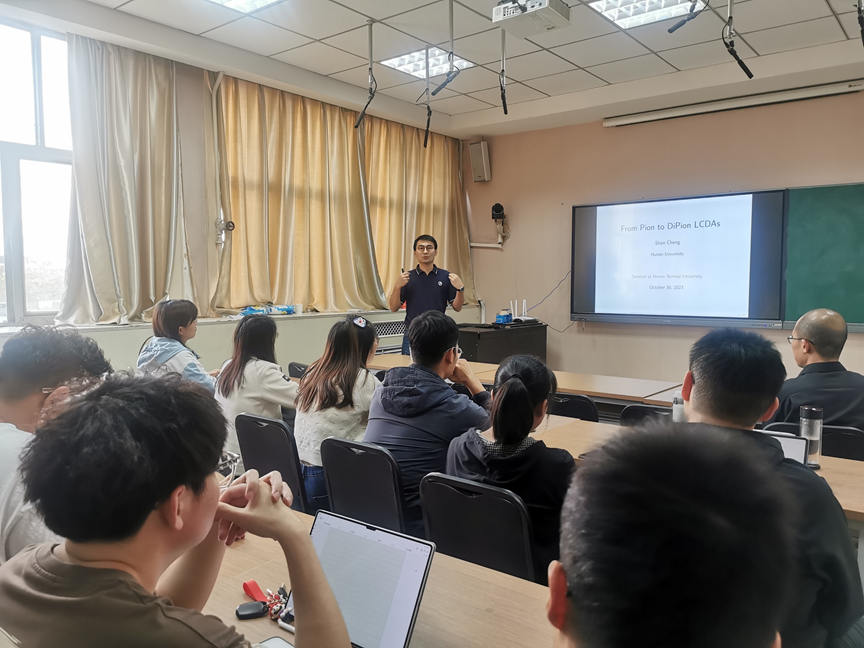 10月30日,应我校物理学院邀请,湖南大学程山教授在物理南楼511报告厅为粒子物理专业的师生呈现了一场精彩的报告,报告题目是“From Pion to Dipion LCDAs”,报告由物理学院常务副院长常钦主持。