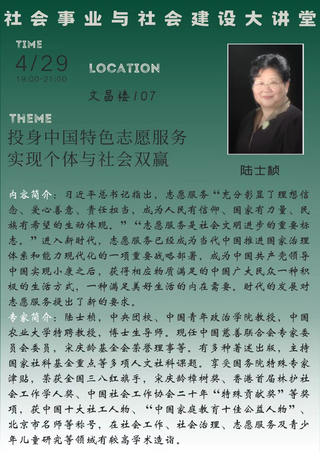 中国青年政治学院陆士桢教授将应邀做客社会事业与社会建设大讲堂