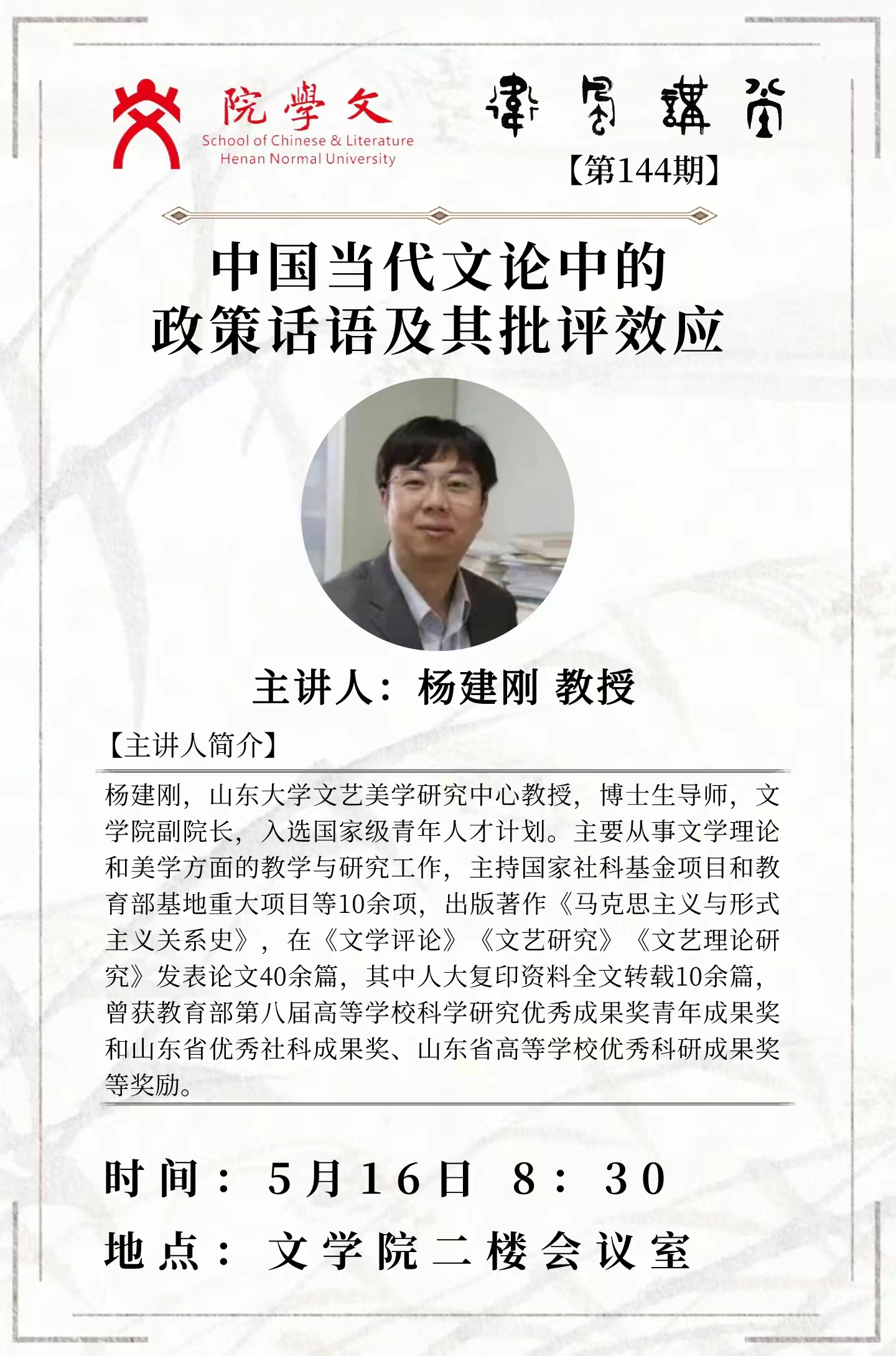 山东大学杨建刚教授将应邀做客“卫风讲堂”