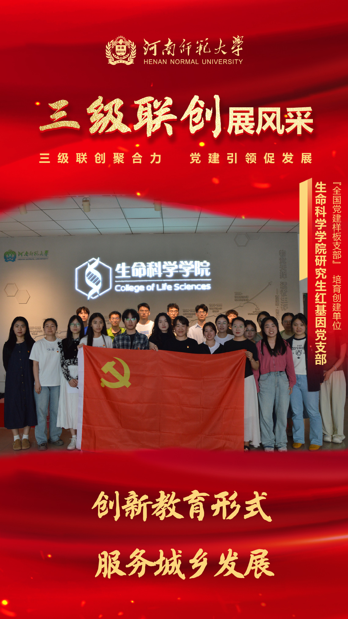 【编者按】习近平总书记指出:“基层是党的执政之基、力量之源。”党的基层组织是党的全部工作和战斗力的基础。基础不牢、地动山摇。为进一步推进学校强基引领“三级联创”工作和“基层党组织建设年”活动,全面梳理基层党建工作新思路、新做法、新成效,不断增强基层党组织组织力、凝聚力、战斗力,持续营造比学赶超、创先争优的浓厚氛围,校园网特推出“三级联创展风采”栏目,总结交流和宣传推广基层党建工作成效,充分发挥先进基层党组织引领示范、辐射带动作用,努力推动党建工作再上新台阶。