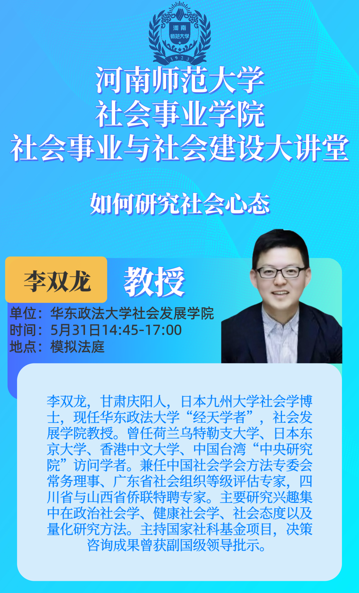 华东政法大学李双龙教授将应邀做客“社会事业与社会建设大讲堂”