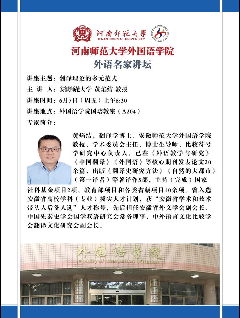安徽师范大学黄焰结教授将应邀做客外语名家讲坛