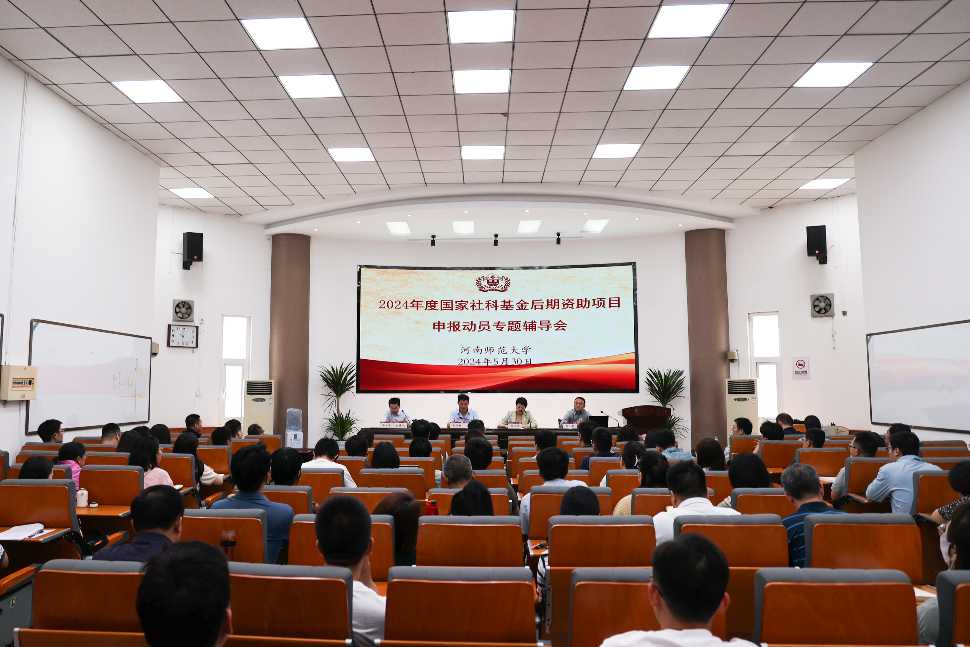 5月30日上午,我校在文学院报告厅召开2024年度国家社科基金后期资助项目申报动员辅导会,会议邀请周口师范学院张洪新教授做专题辅导。校党委常委、副校长杨玉珍出席会议并做总结讲话,各文科学院科研院长、科研秘书、拟申报2024年度和2025年度国家社科基金后期资助项目教师及社会科学处全体人员100余人参加会议。会议由社会科学处副处长张继汝主持。