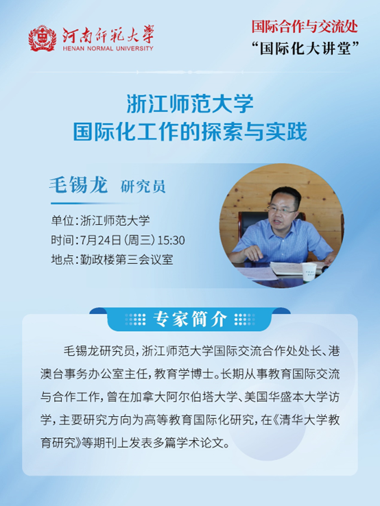 浙江师范大学毛锡龙研究员将受邀做客“国际化大讲堂”