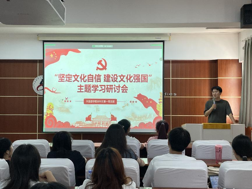 为深入学习贯彻党的二十大精神,提高学生党员的思想认识和文化素养,近期,外国语学院本科生第一党支部举办了以“坚定文化自信 建设文化强国”为主题的学习研讨会。此次会议由支部书记钱江红主持,支部全体党员参加。