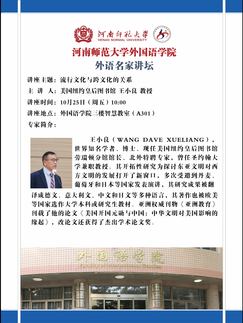 美国纽约皇后图书馆王小良教授将应邀做客“外语名家讲坛”