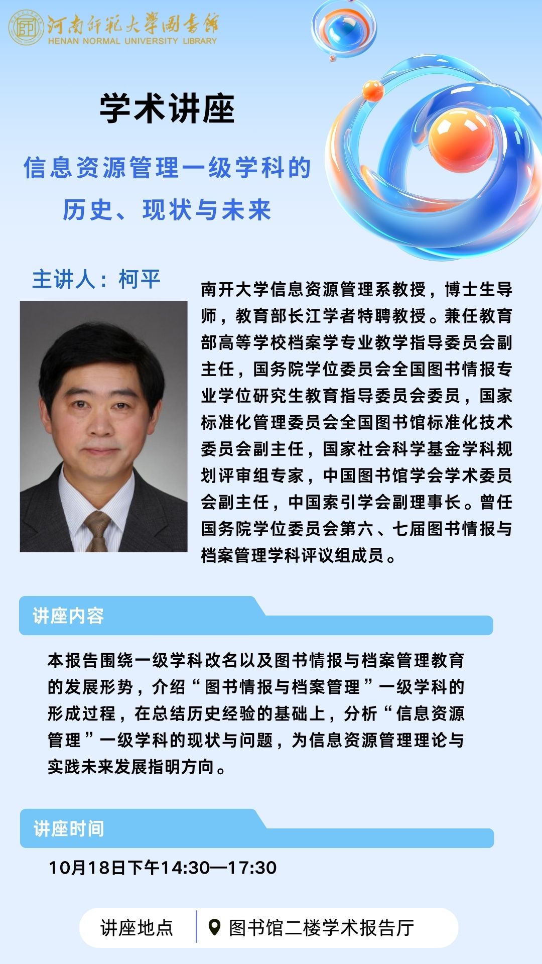 南开大学信息资源管理系柯平教授将应邀做客图书与档案信息中心