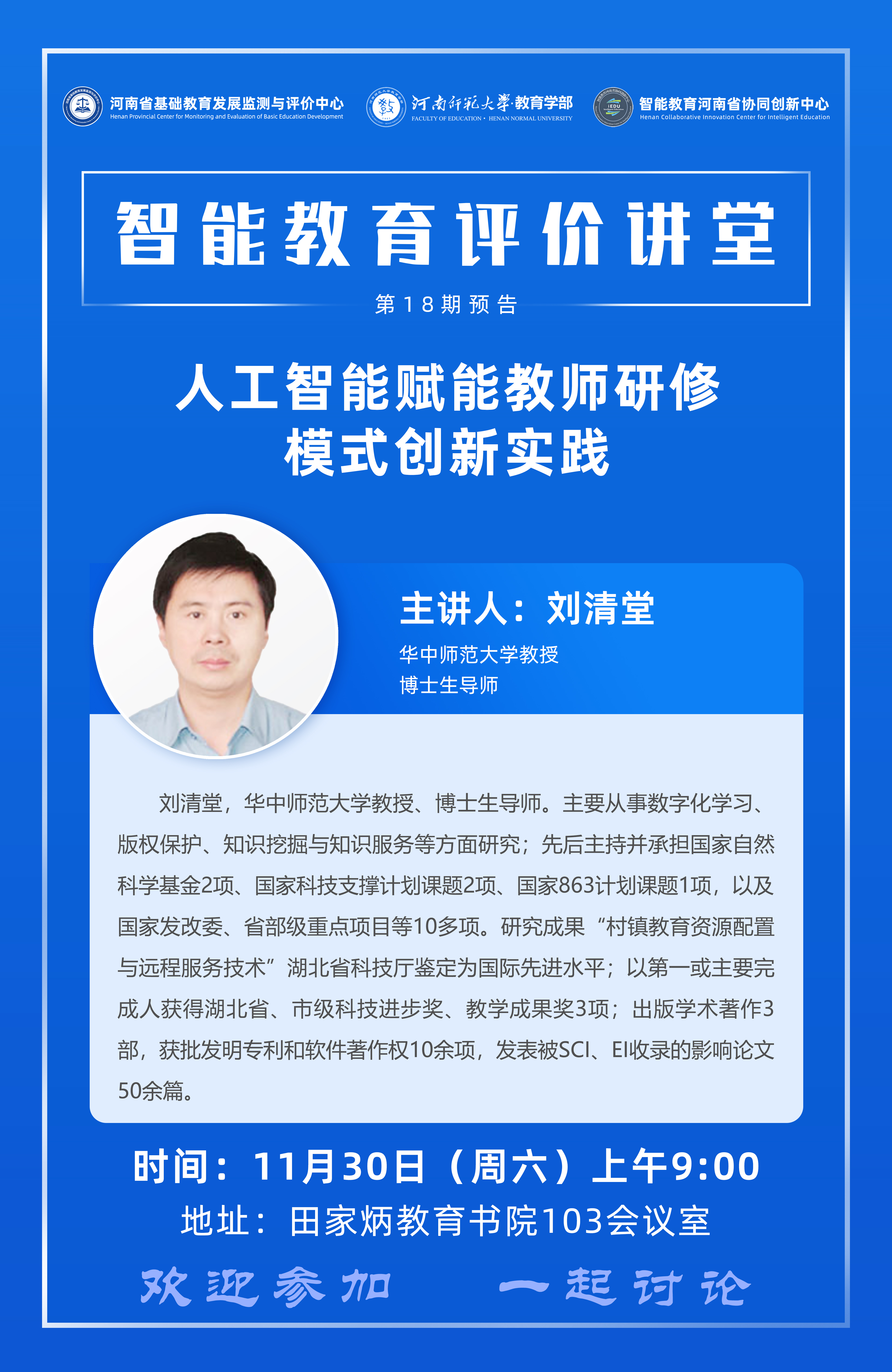 华中师范大学刘清堂教授将应邀做客智能教育评价讲堂