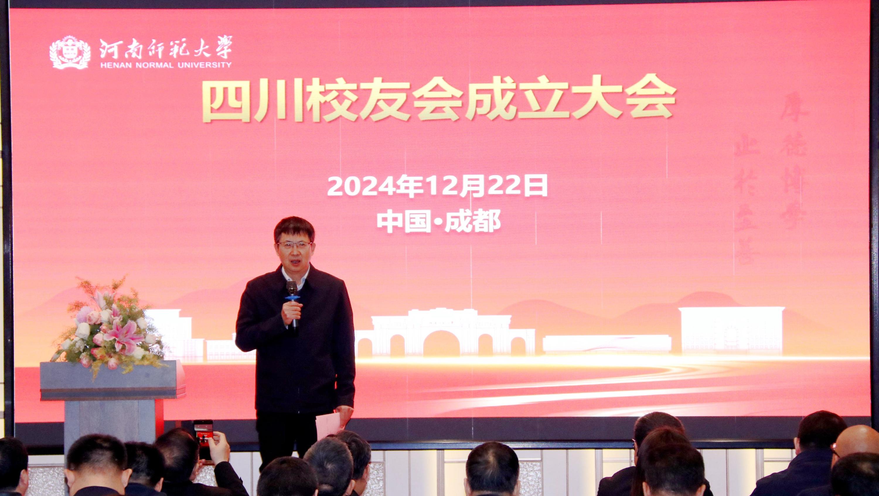 张尚字代表学校对四川校友会的成立表示热烈祝贺,对筹备组成员的辛苦付出表示衷心感谢。他简要回顾了一年来学校在高端人才引育、引领示范河南基础教育、科技创新能力、服务地方经济社会、学科专业布局、科技创新港建设等方面取得的突出成绩,与校友们共同分享母校的荣光。他指出,校友永远是母校事业发展最可信赖和依靠的力量,是母校事业改革发展的不竭动力。希望广大校友秉承“厚德博学、止于至善”的校训,传承“崇文明道、尚诚守德、抱朴求真”的师大精神,立足岗位,甘于奉献,服务地方经济社会发展;希望四川校友会充分发挥桥梁纽带作用,进一步凝聚校友力量,发挥校友智慧,助推母校高质量发展。