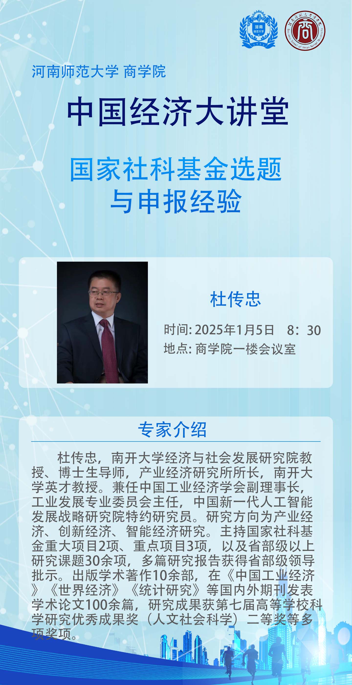 南开大学经济与社会发展研究院杜传忠教授将应邀做客中国经济大讲堂
