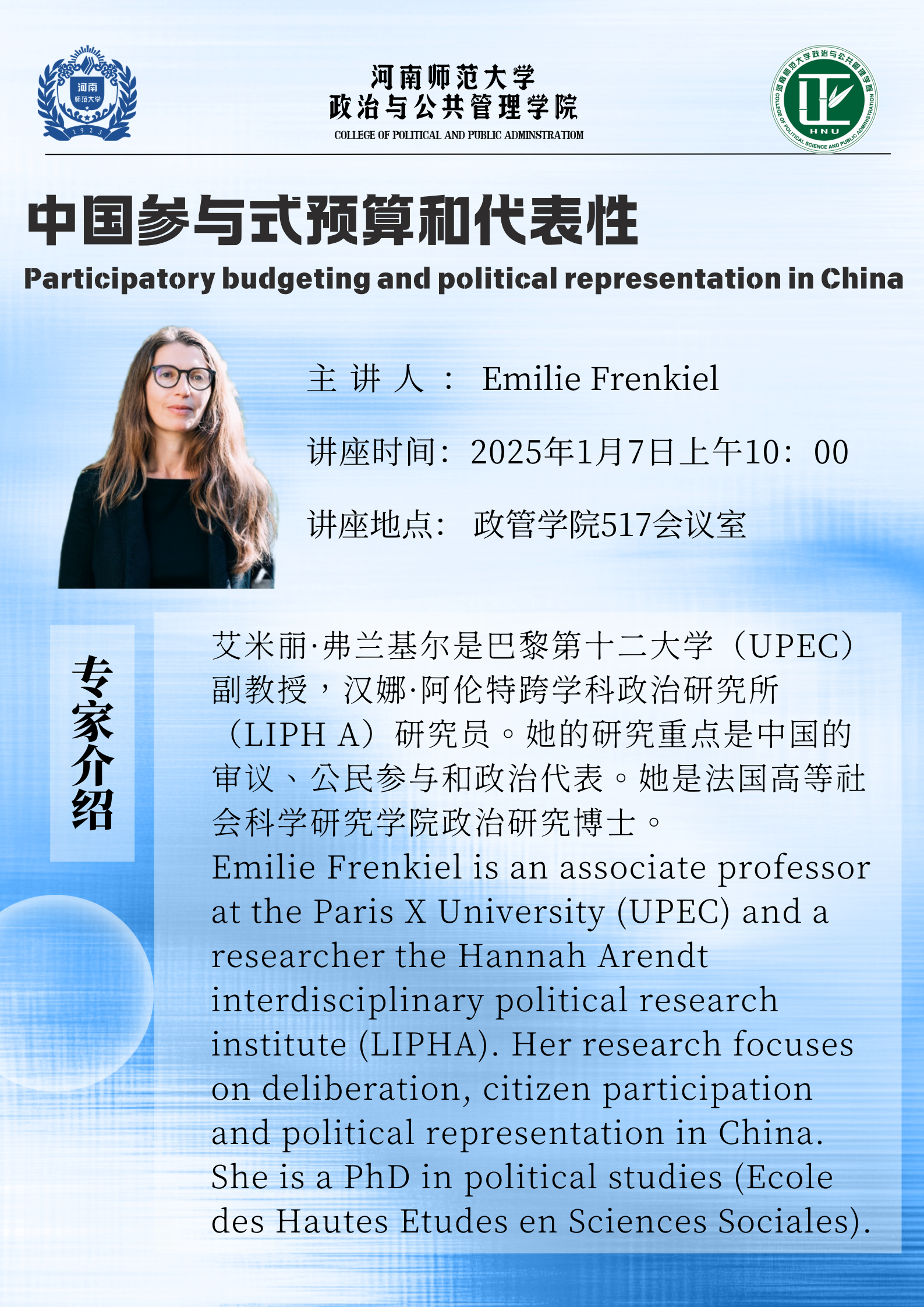 巴黎第十二大学艾米丽·弗兰基尔教授将应邀做客牧野讲堂·博雅论坛