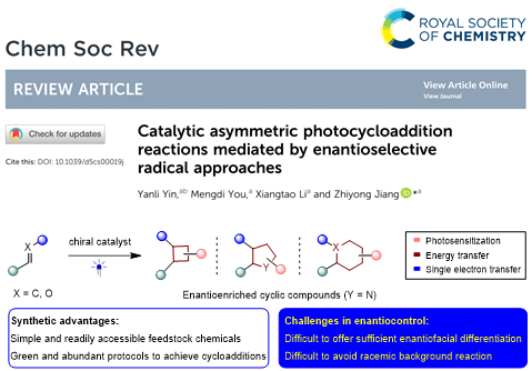近日,我校化学化工学院江智勇教授团队在化学类综述期刊 Chemical Society Review(IF 40.4) 上发表了题为Catalytic asymmetric photocycloaddition reactions mediated by enantioselective radical approaches 的综述论文,文章系统总结了自由基介导的催化不对称光催化环加成反应的基础和应用进展。青年教师尹艳丽博士为第一作者,江智勇教授为通讯作者。