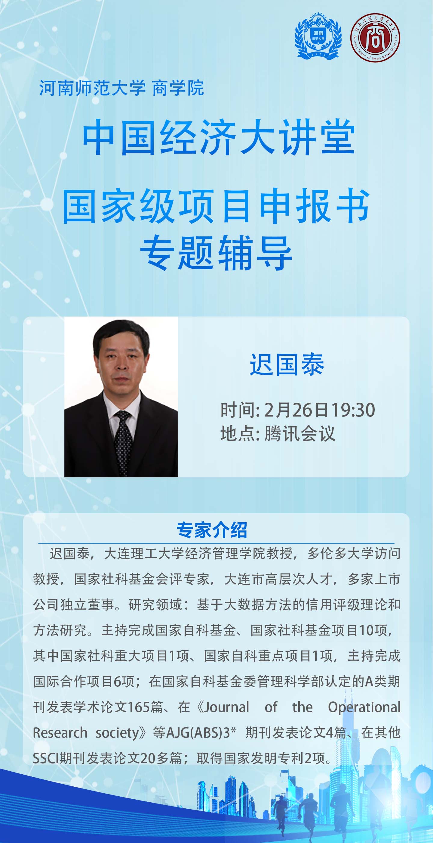 大连理工大学迟国泰教授将应邀做客“中国经济大讲堂”