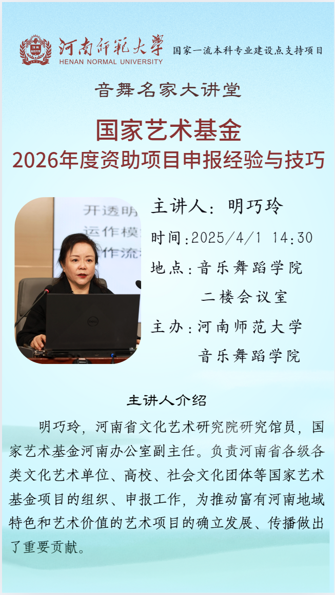 河南省文化艺术研究院研究馆员、国家艺术基金河南办公室副主任明巧玲将应邀做客“音舞名家大讲堂”