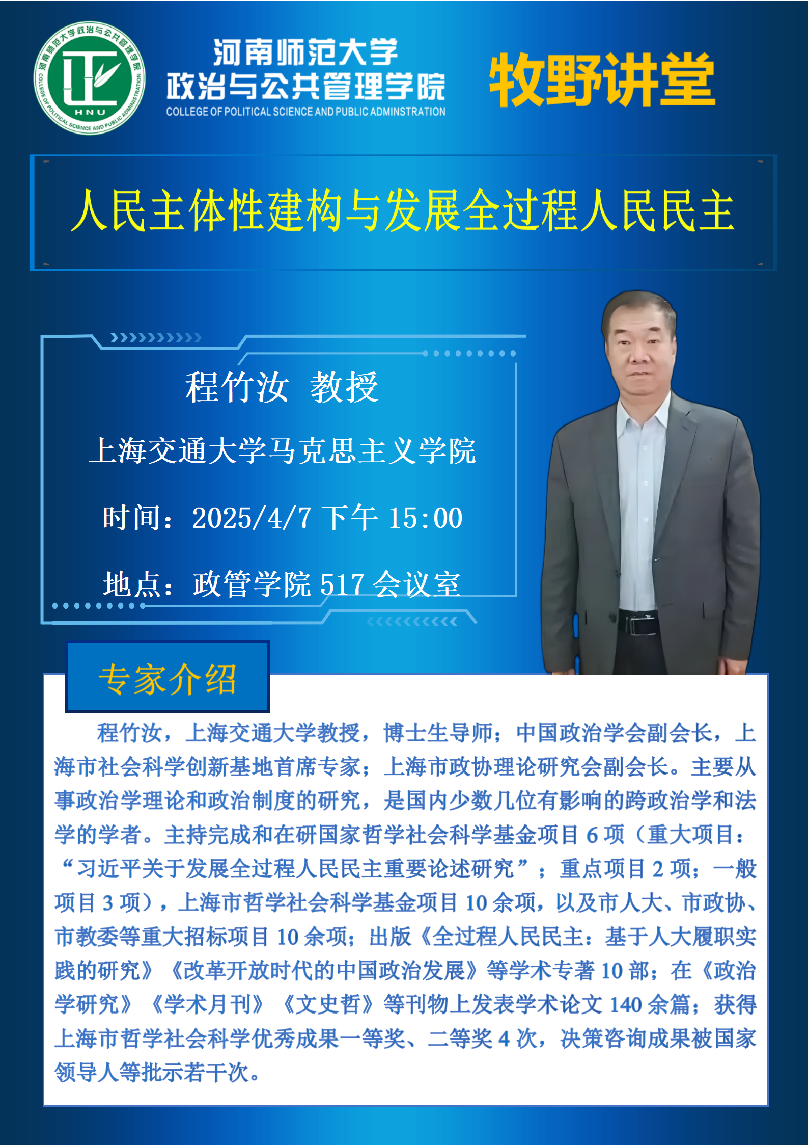 上海交通大学程竹汝教授将应邀做客“牧野讲堂”