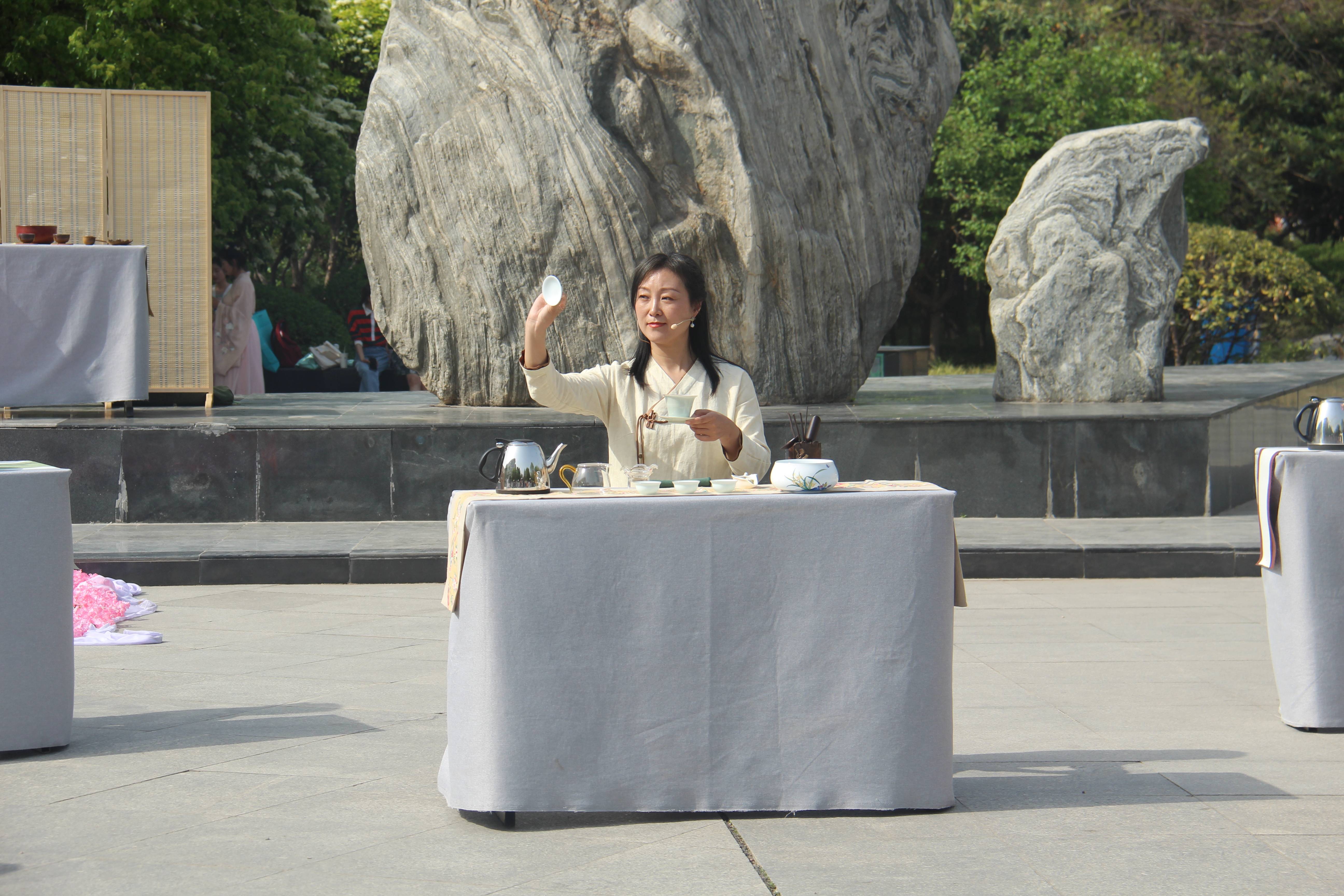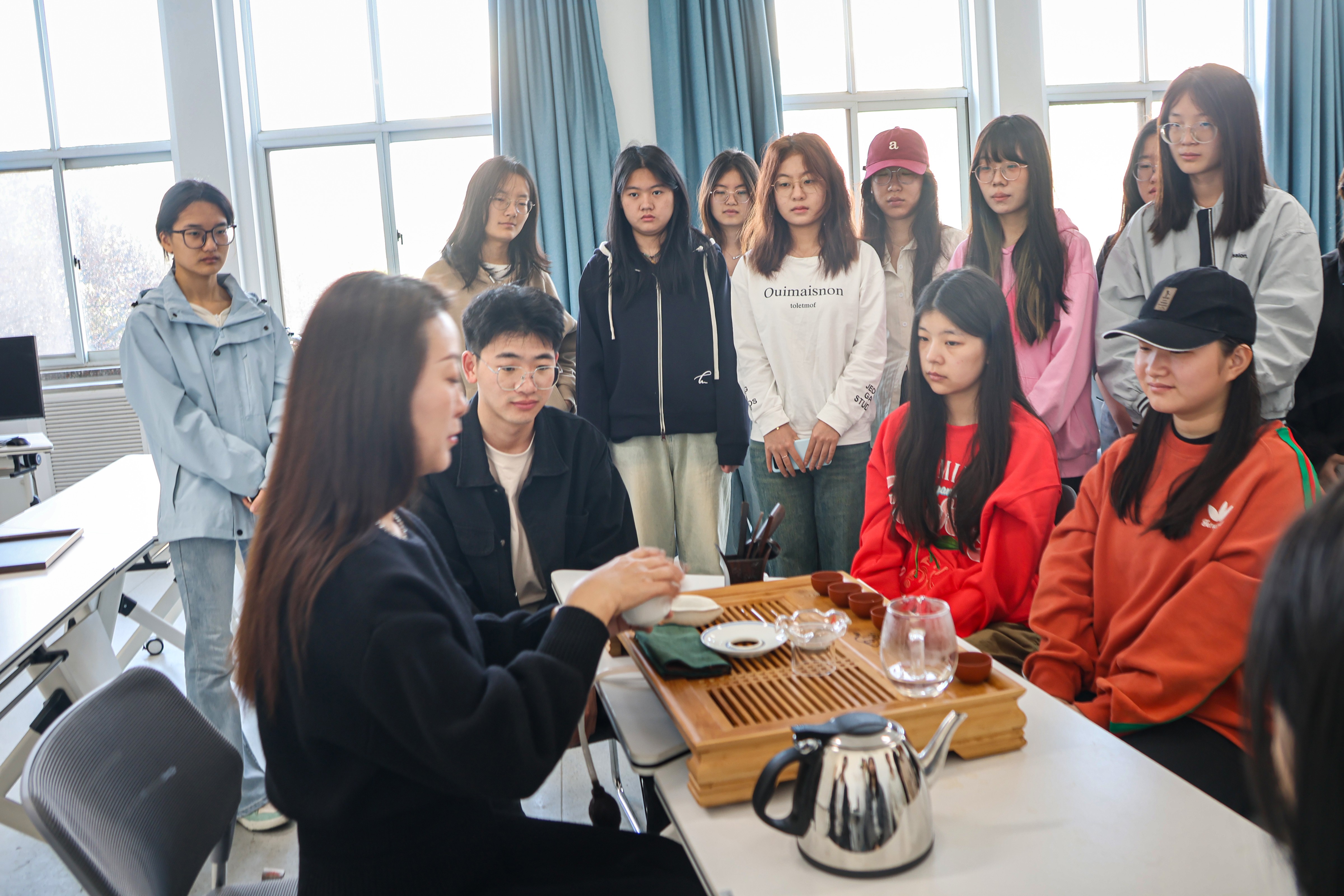 “课程最大亮点在于对传统文化的弘扬与继承。”王晶介绍道。中国茶的传统制茶技艺及相关习俗于2023年11月申遗成功,正式成为世界非物质文化遗产。课程以此为契机,将非遗保护与传承融入教学,致力于让年轻学生通过生动有趣的方式了解并喜爱传统茶文化。茶文化本身具有极强的包容性,课程巧妙地将诗歌、书法、音乐、舞蹈等古典艺术形式融入教学内容,形成“以茶为媒”的学习模式。在学校举办的“花间茶语”主题活动中,师生共同排演宋代点茶技艺的情景剧,结合书法展示与古典乐器演奏,还原文人雅士品茗论道的场景,深受学生喜爱。此外,课程打破传统课堂边界,将教室内的理论教学与校园实践活动紧密结合——课堂上系统学习茶文化历史与技艺,课堂外通过茶艺社和茶艺表演队组织茶席设计、茶会策划、茶艺表演等实践,形成“第一课堂夯实基础、第二课堂激发兴趣”的立体化教学模式,真正实现“文化传承在校园生根,青春力量为非遗添彩”。