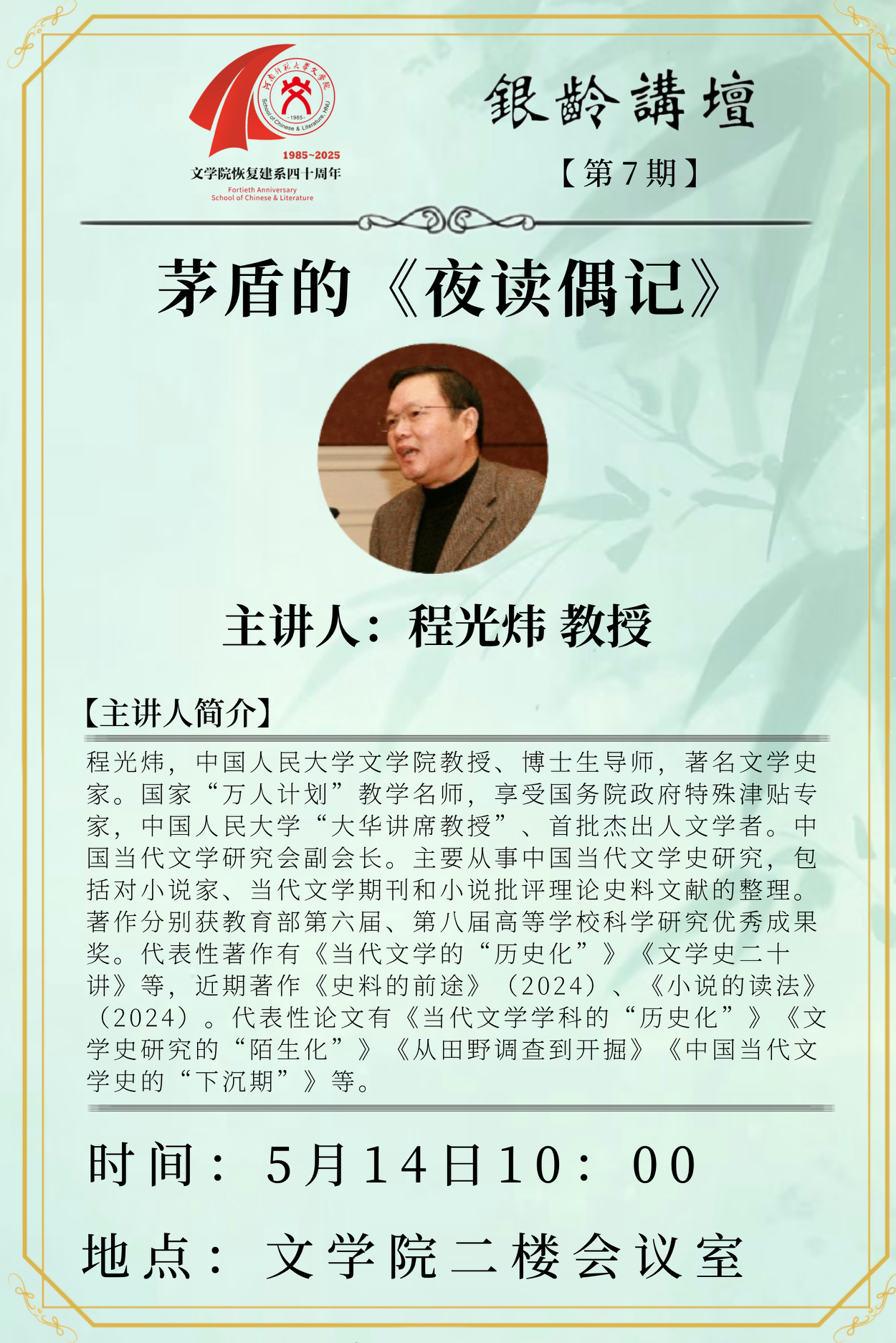 中国人民大学程光炜教授将应邀做客文学院“银龄讲坛”