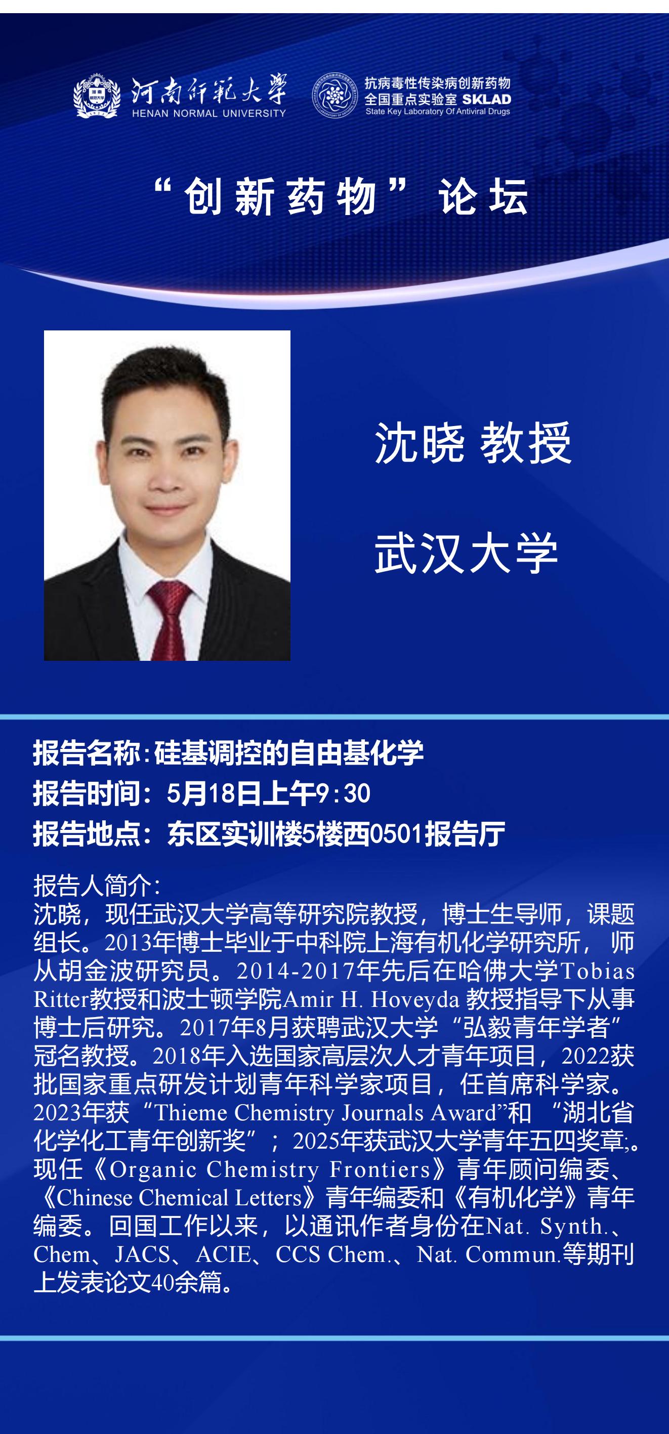 武汉大学沈晓教授将应邀做客“创新药物”论坛