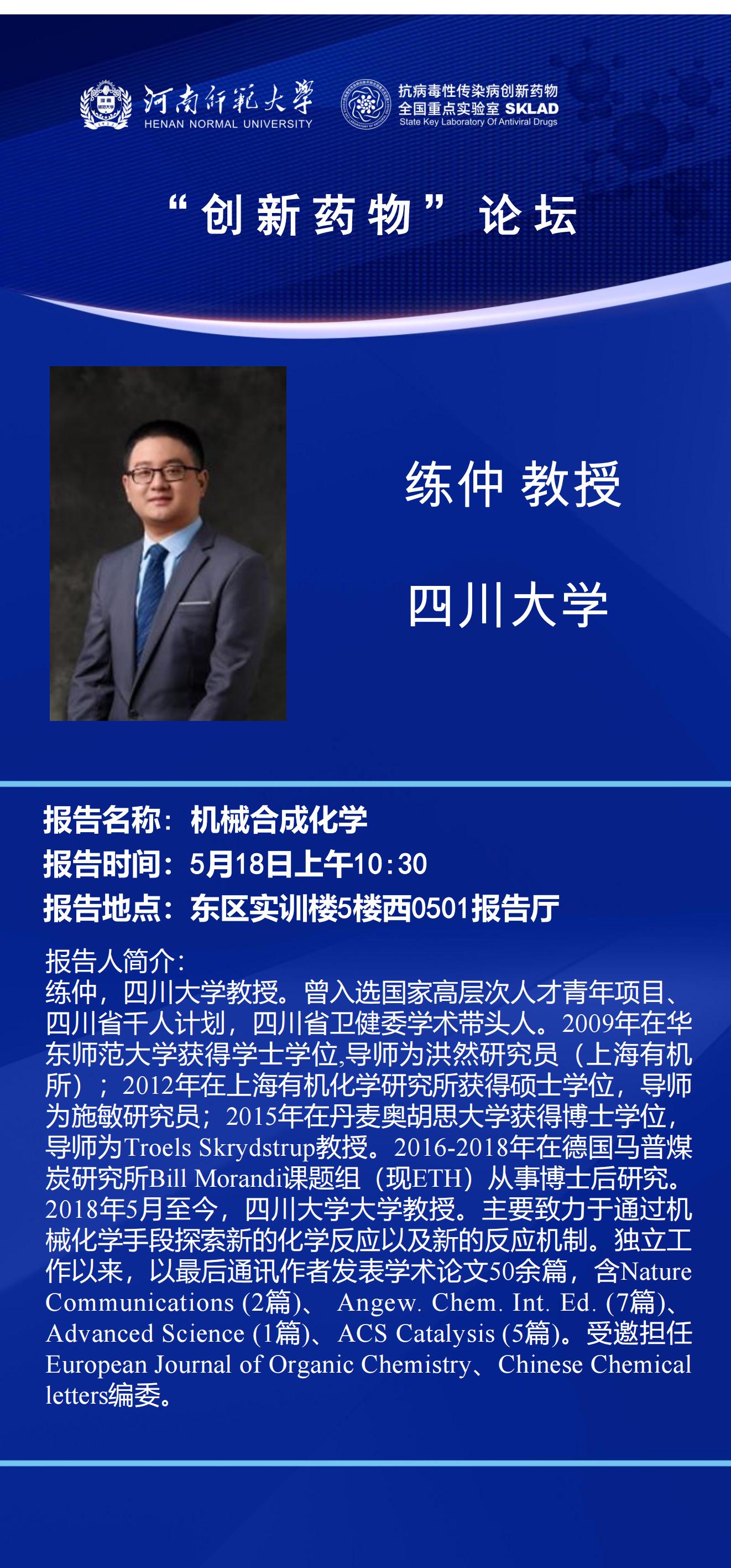 四川大学练仲教授将应邀做客“创新药物”论坛