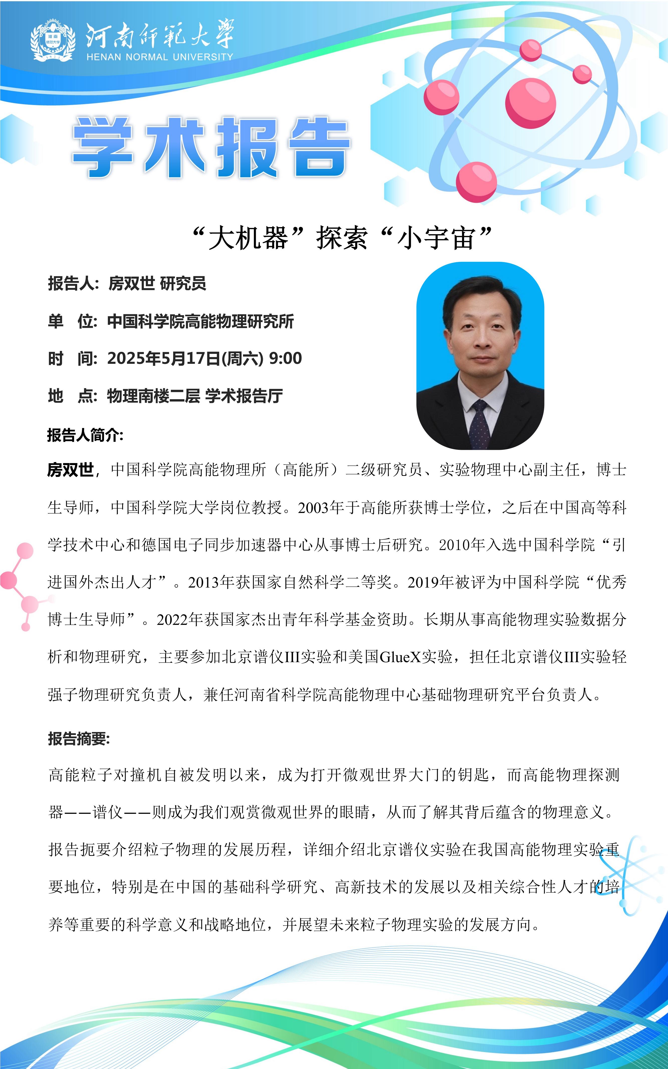 中国科学院高能物理研究所房双世研究员将应邀做客“八角楼”讲坛